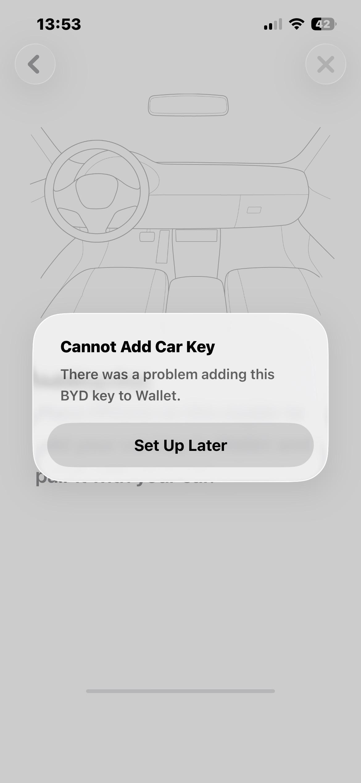 System version: 13.1.32.2505120.1 Hardware version: V02.E03.00.32.03 I have a BYD ATTO 3 which I bought early/mid 2025. I have recently noticed there is a digital key option in the BYD App. I am on iPhone and when I try to add it to wallet I am told to put my phone on the reader. The only reader I am aware of is outside the car on the right mirror. After I do this I get a “there was a problem adding this BYD Key”. Is it not supported or am I doing something wrong?
