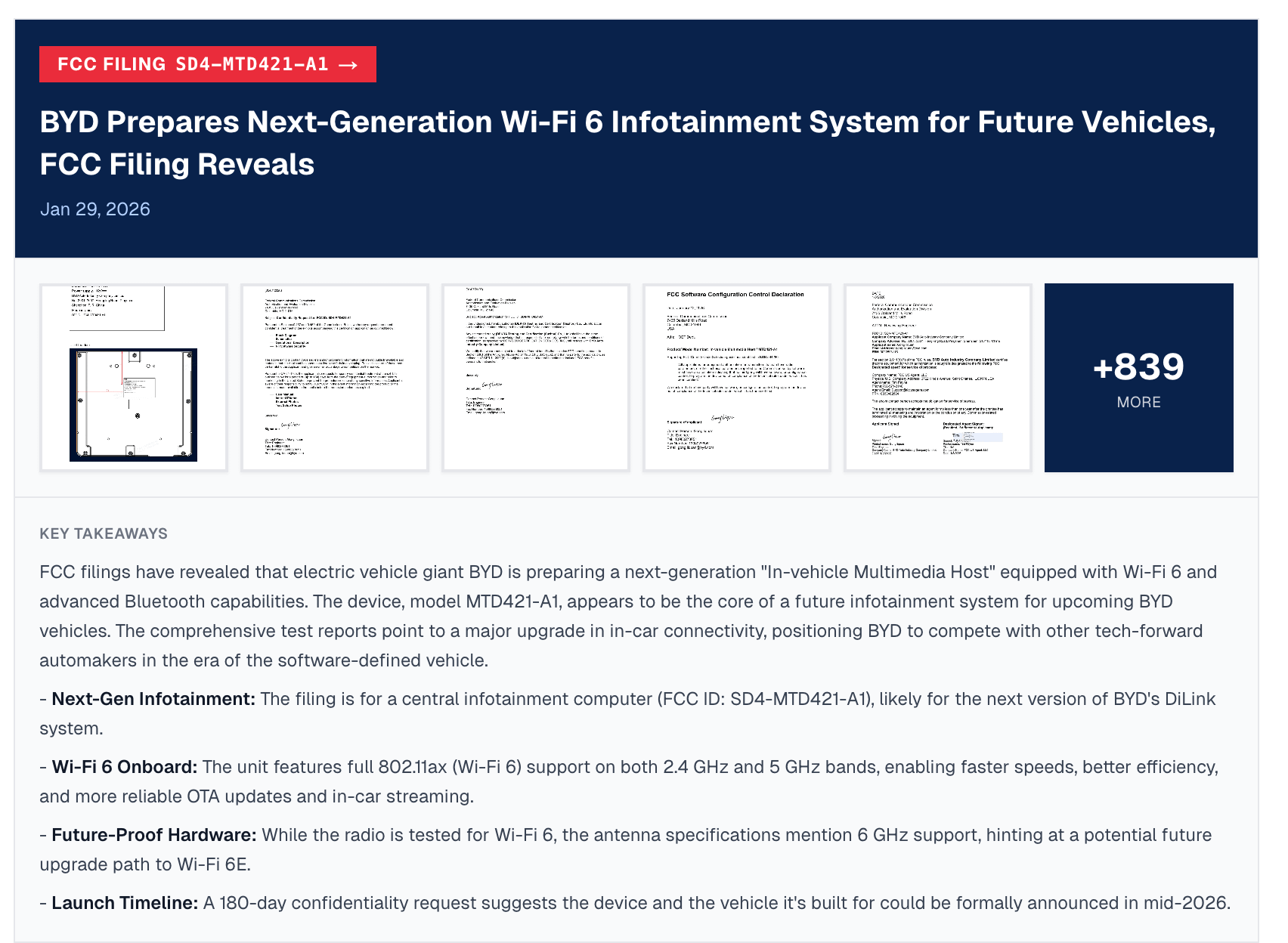 Hey everyone, was doing some digging through recent FCC filings and stumbled upon what looks to be the brains of a next-gen DiLink system from BYD. The filing is for a new central infotainment unit (model MTD421-A1) that's packing Wi-Fi 6, which is a massive upgrade. This should mean way faster and more reliable OTA updates, better in-car media streaming, and just a much snappier experience overall. https://preview.redd.it/m5wibwg06dgg1.png?width=1704&format=png&auto=webp&s=922d4e585ad96826e07c7056a2e0bc047856efb1 What's really interesting is that while the radio is tested for Wi-Fi 6, the specs hint at future-proofing for Wi-Fi 6E. Based on the confidentiality request, we might not see this in a production car until mid-2026, but it's clear BYD is getting serious about their in-car tech. Besides just raw speed, what's the one software feature or improvement you're hoping this new hardware enables for DiLink? Source: [https://www.fccidlookup.com/report/byd-next-gen-wifi6-infotainment-hub-fcc-filing-SD4-MTD421-A1](https://www.fccidlookup.com/report/byd-next-gen-wifi6-infotainment-hub-fcc-filing-SD4-MTD421-A1) [https://www.fccidlookup.com/fccid/SD4-MTD421-A1](https://www.fccidlookup.com/fccid/SD4-MTD421-A1)