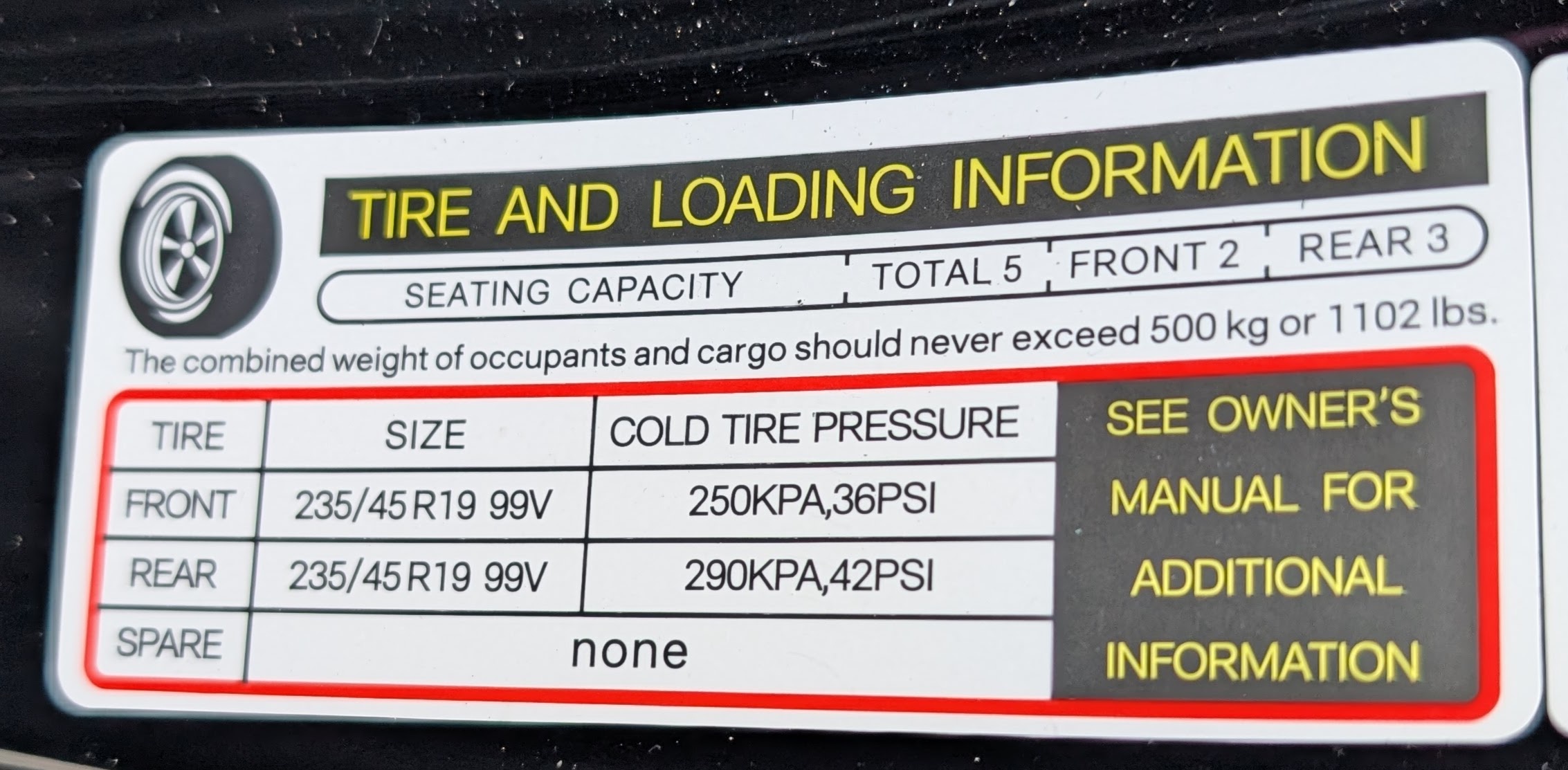 You need to top up your tyres: they're low. The back tyres are supposed to be 42psi, while the front ones are supposed to be 36psi. You can check these are the correct values for your car by looking at the "Tire And Loading Information" sticker on the inside of the driver's side door (at least on Australian models).