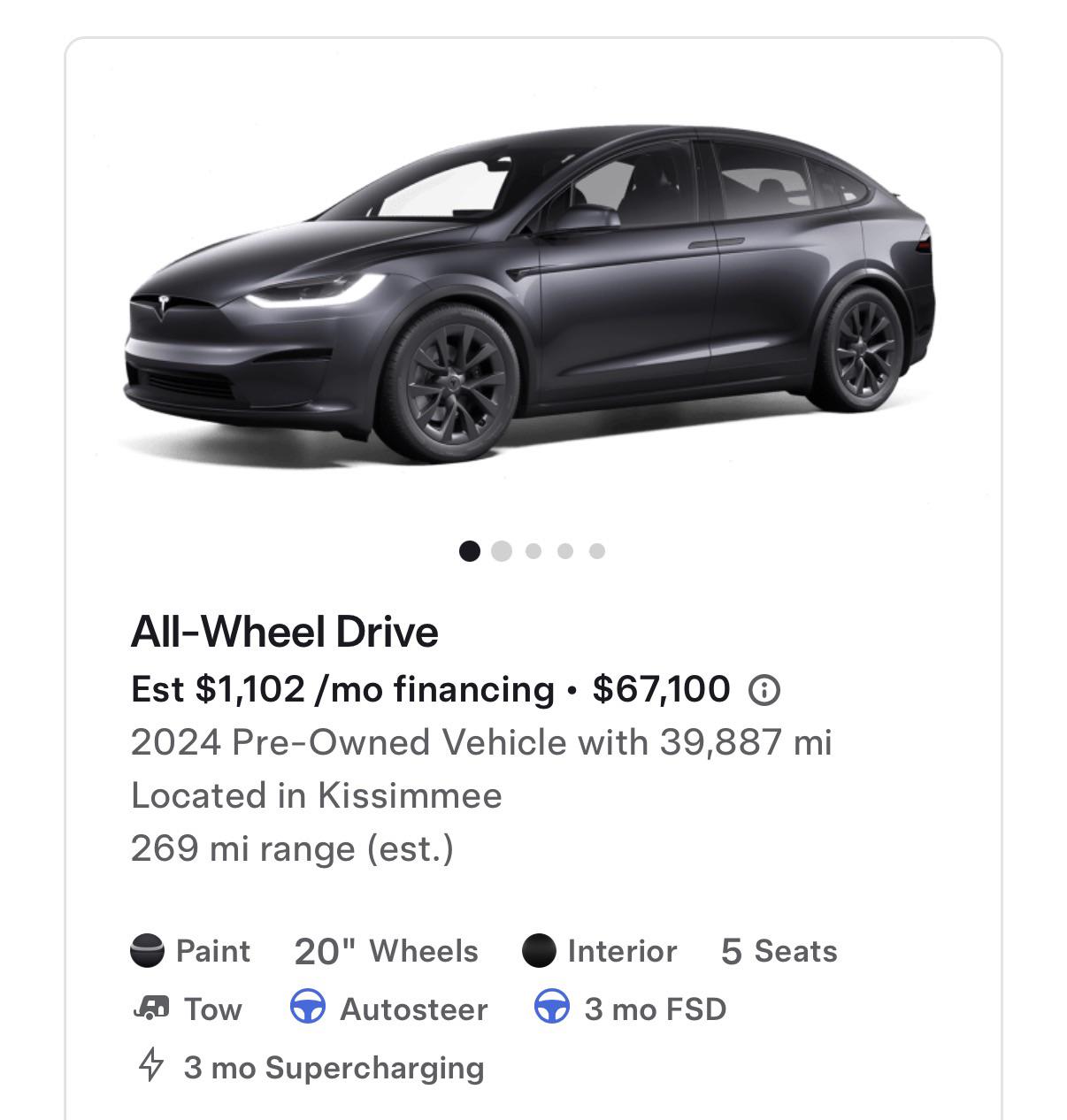 If you use this website https://teslaroamer.com/inventory/new (you can filter by model, year and FSD computer) You can get a 2023 Model X with HW4 for less than this one. I bought a used 2023 Model X Plaid for 69k with 52k miles at Tesla. It came with HW4 and 22 inch wheels, white with white interior which was exactly what I was looking for. I bought it at Tesla specifically for the warranty which I already used to replace both front half shafts as well as the passenger front door panel which had the emergency door release slightly cracked. Even though the car had over 52k miles when I bought it, they allowed me to subscribe to the extended warranty which will kick in once my used vehicle warranty expires. That being said, if you do not care much about the warranty, buying one used outside of Tesla with less than 50k miles might be the way to go to save some money. Me personally I just do not like dealing with dealers or people.