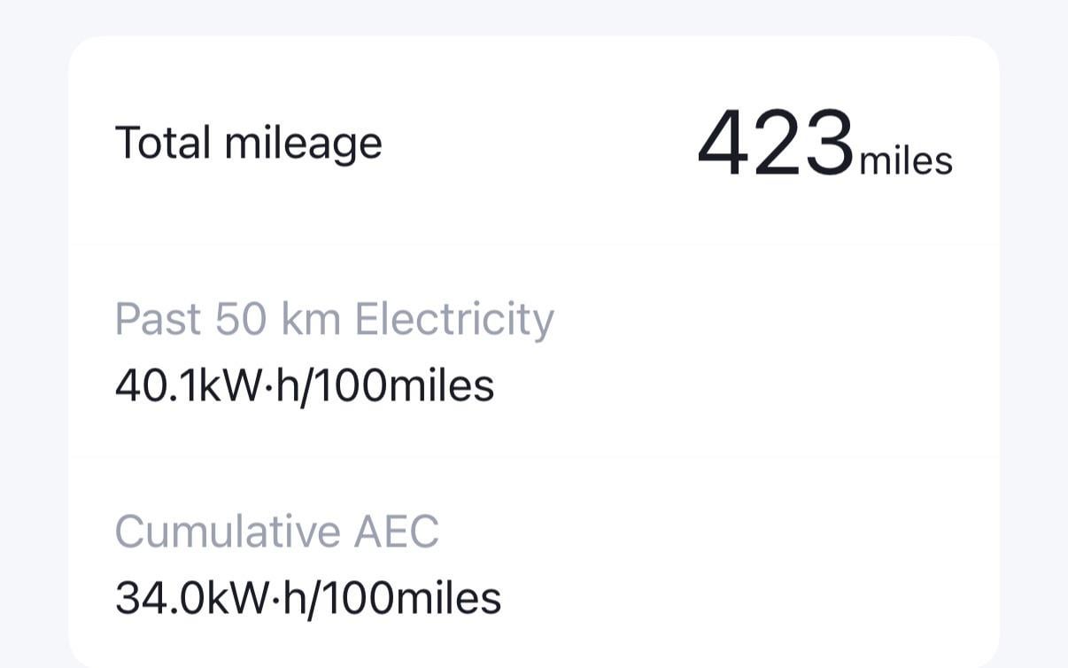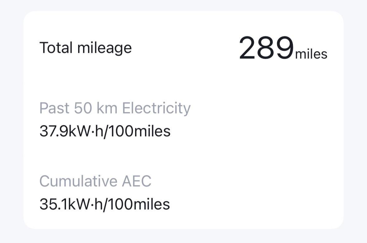 Note that it’s saying past 50km but then showing the result in miles. 37.9 kWh/100 miles roughly equates to 23.6 kWh/100 km which seems very normal to me, specially if you live in a country that is not flat or if you like to feel the speed of your Seal :)