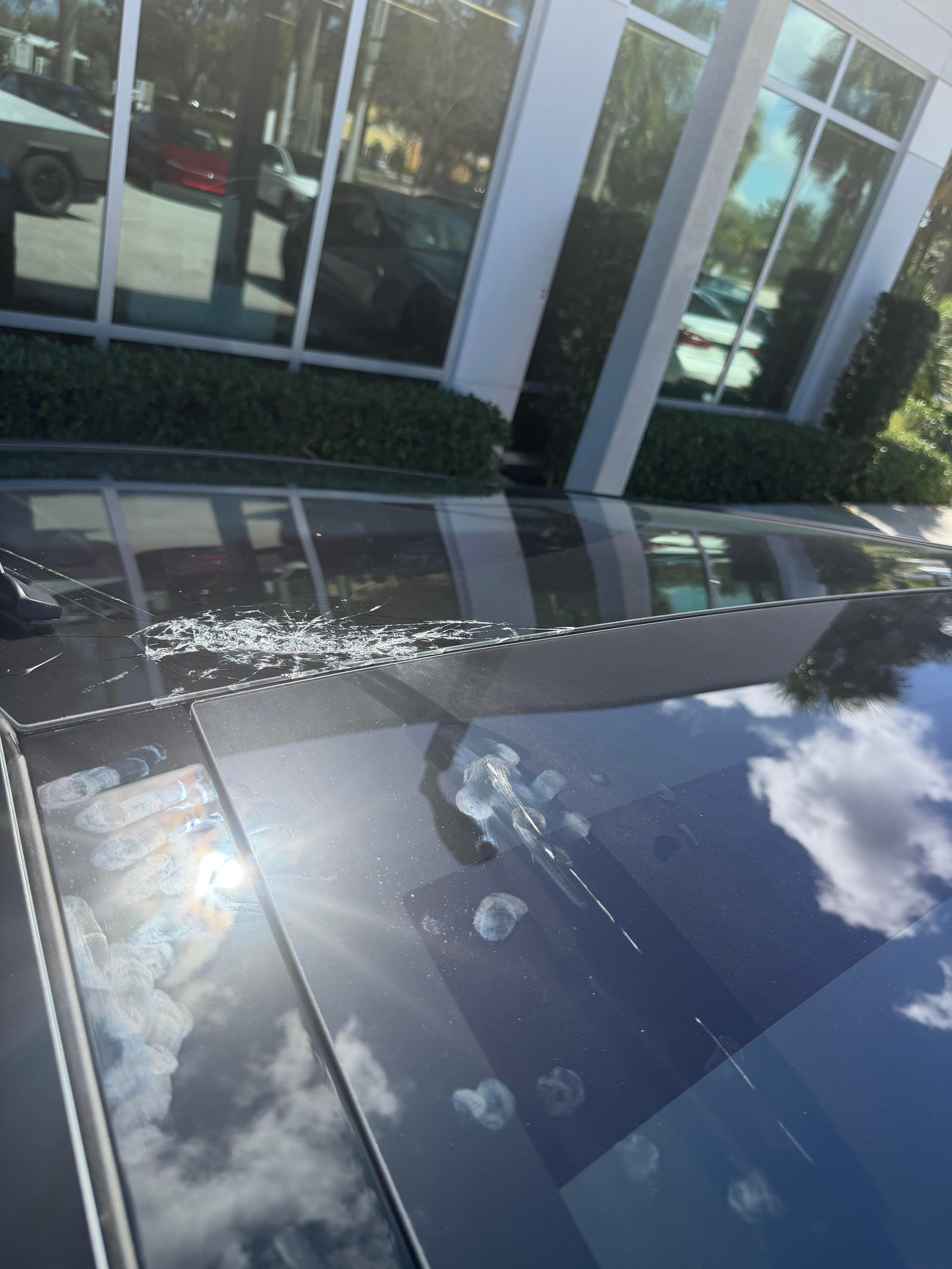 It's hard to tell but did it also crack the roof glass? That one two punch would cost $5,000 to $6,000 to repair.