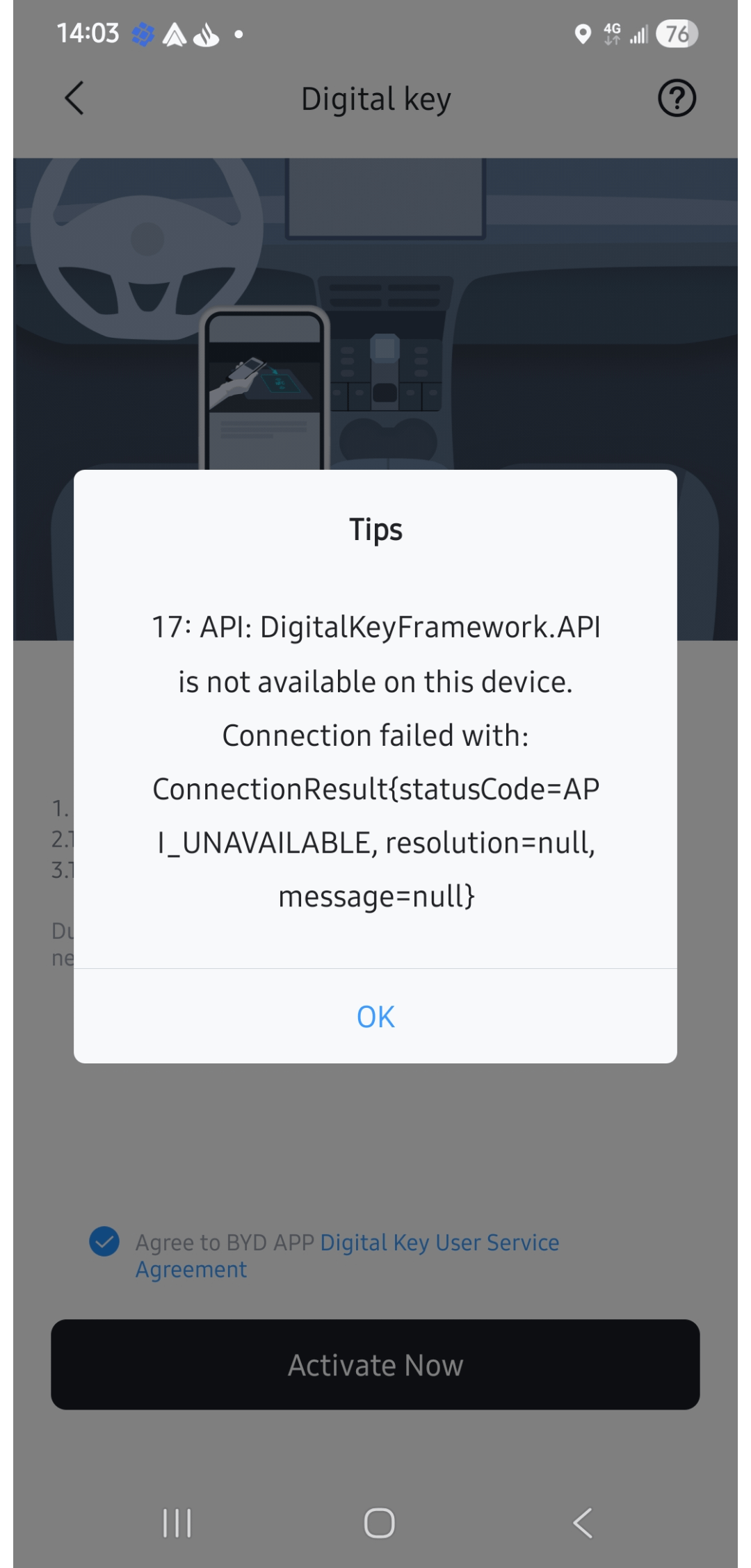 I'm getting this error when trying to add a digital key on my Samsung S24 Ultra. Already tried to update all requires Google services, remove and reinstall the BYD app, but always get the same error. Any help?