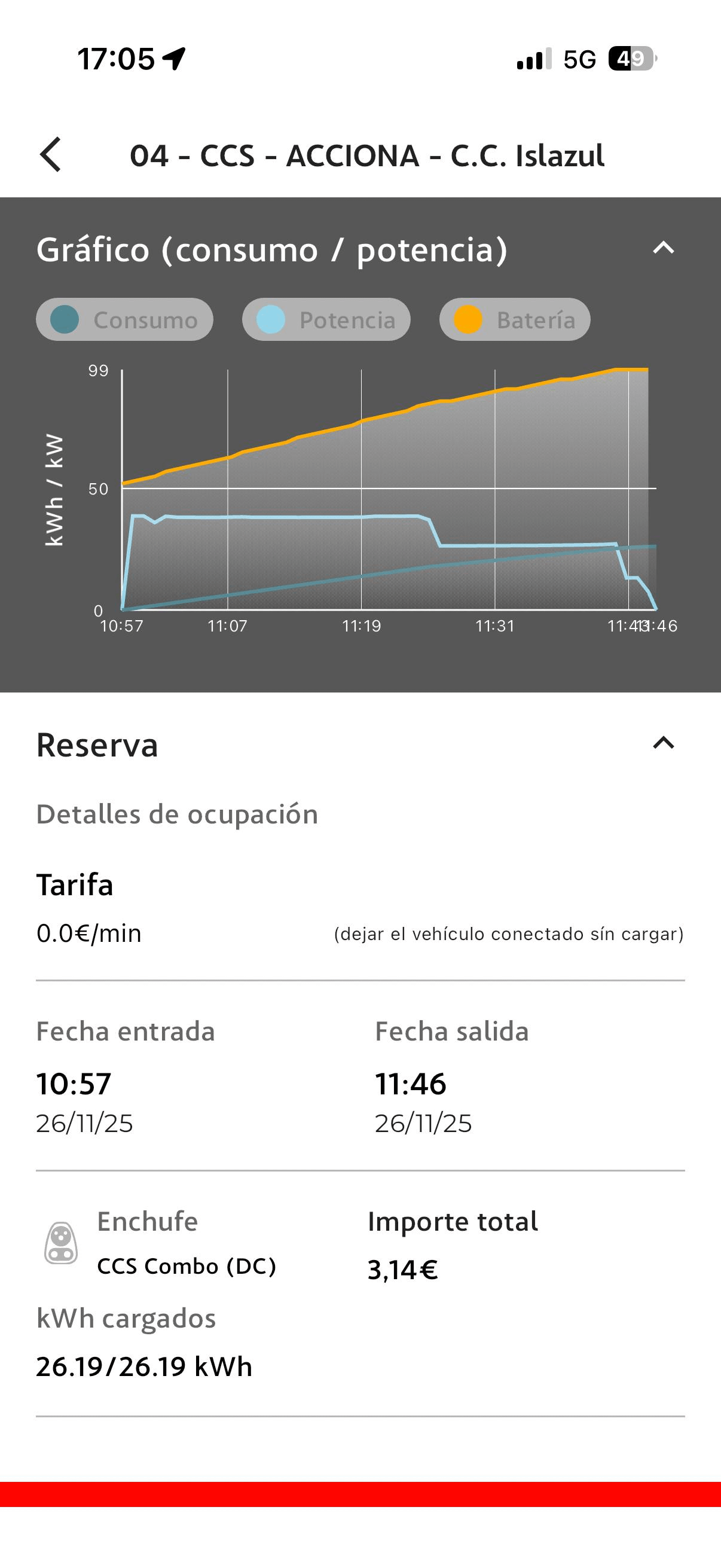 Acciona y su app son... digamos... una cosa "especial" La forma en al que funcionan es que cuando lo activas, sea directo o reserva previa, lo que estás seleccionando es kWh, la carga que vas a realizar. Acciona, según el cargador calcula cuanto tardaría en hacer esa carga y bloquea el cargador durante ese tiempo además de indicarte el precio de dicha carga/cargador. Ahora bien, ese precio es el supuesto completo por lo que hay varias opciones: 1. Cargas la cantidad indicada = pagas el precio indicado 2. Cargas menos cantidad de la indicada = pagas el precio correspondiente a esa carga 3. Superas el tiempo de carga = pagas la parte correspondiente y el coche deja de cargar Yo siempre voy en automatico, dejo todo por defecto y lo maximo que habré llegado a pagar han sido 5,5/6€ por cargar mi Surf de \~5% a 100% Por norma general TODAS las empresas te cobran un extra si superas el tiempo establecido. Dependiendo de la empresa y/o cargador (por donde se ubique físicamente) este tiempo puede ser límite (ej: 30mnts) o que cargues el coche en su totalidad, no pongo el ejemplo de Acciona pero te haces a la idea, creo que no hay ninguna otra app que funcione así. Acciona en Islazul no cobra por dejarlo tiempo de más, te lo indica en la app cuando accedes al cargador y creo que cuando está cargando también, revisalo cuando puedas. Eso sí, un poco de cabeza y civismo, si finalizas, mueve el coche de sitio, aunque sea a una plaza que no funcione el cargador. Llevo una rachita con gente que siquiera tiene la manguera conectada que pa que https://preview.redd.it/qq9q1x349p3g1.png?width=328&format=png&auto=webp&s=0839b89778d0f2a32372a303119e6892c3fed8d2 Una última cosa, aunque te encuentes con que un cargador no te penaliza por dejarlo tiempo de más, ten en cuenta la siguiente señal de tráfico tanto en tu beneficio como en tu contra porque se puede llamar a la policia para que te quiten el coche con la grua