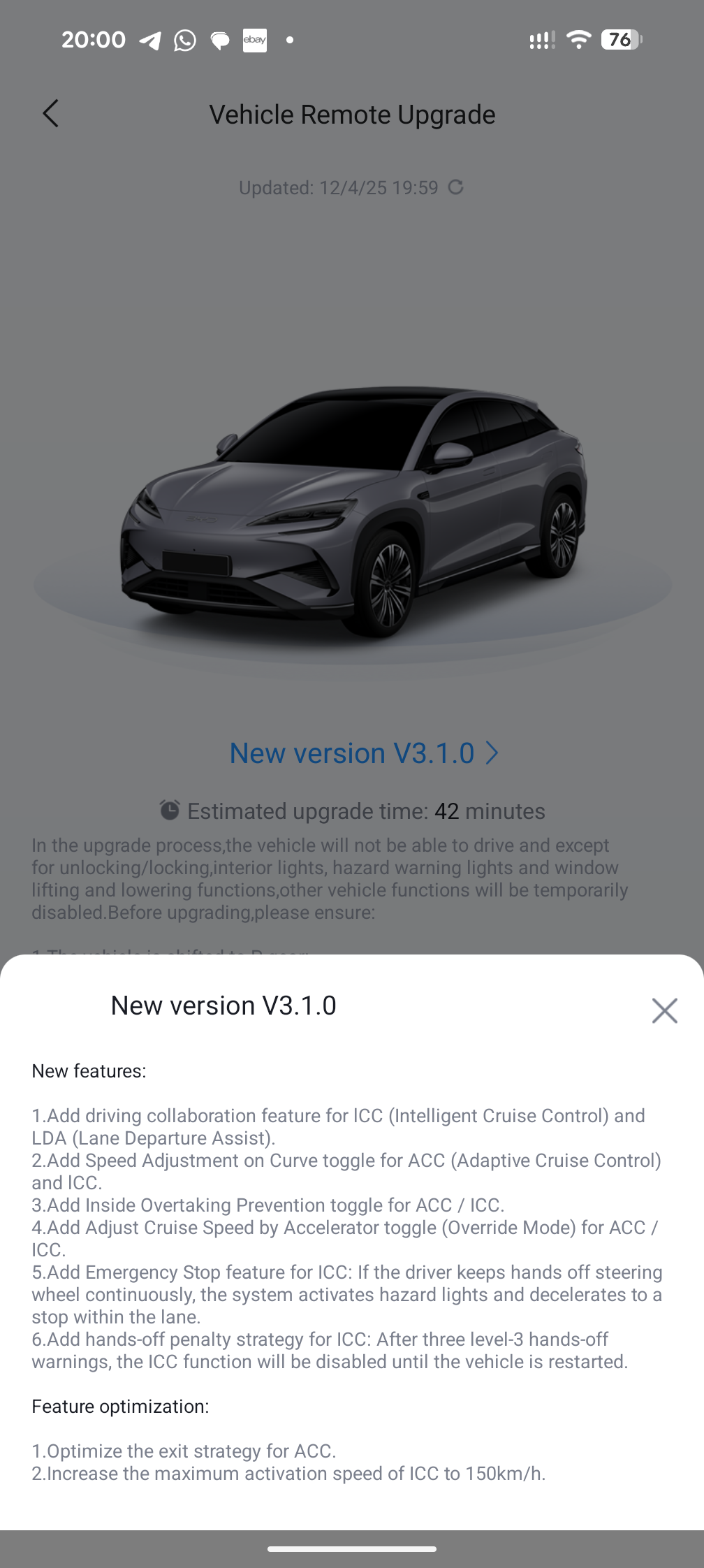 I extracted the text from OP's image for convenience: > **New features:** > > 1. Add driving collaboration feature for ICC (Intelligent Cruise Control) and LDA (Lane Departure Assist). > 2. Add Speed Adjustment on Curve toggle for ACC (Adaptive Cruise Control) and ICC. > 3. Add Inside Overtaking Prevention toggle for ACC / ICC. > 4. Add Adjust Cruise Speed by Accelerator toggle (Override Mode) for ACC / ICC. > 5. Add Emergency Stop feature for ICC: If the driver keeps hands off steering wheel continuously, the system activates hazard lights and decelerates to a stop within the lane. > 6. Add hands-off penalty strategy for ICC: After three level-3 hands-off warnings, the ICC function will be disabled until the vehicle is restarted. > > **Feature optimization:** > > 1. Optimize the exit strategy for ACC. > 2. Increase the maximum activation speed of ICC to 150km/h.