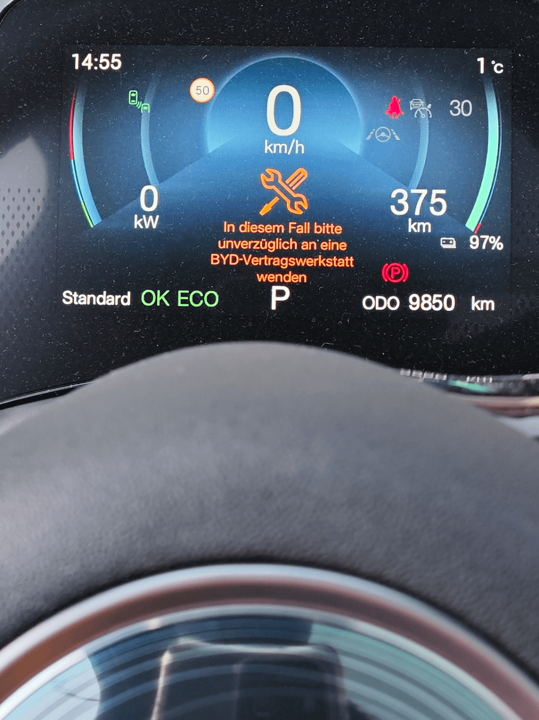 Hi, for the past few days, the following information has been appearing briefly in our Atto3. The german translation is maybe a bit misleading but I am not sure if I need to respond immediately or wait until the tool symbol appears somewhere else? The translation: "in this case, please go to a BYD repair center"