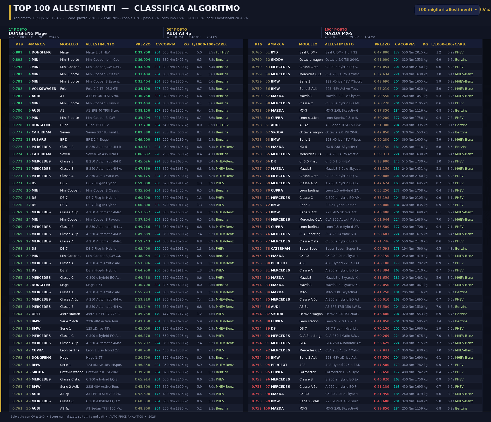 Aggiungo questa versione top100 allestimenti, si può migliorare l'algoritmo https://preview.redd.it/rze05w00zupg1.png?width=1892&format=png&auto=webp&s=6a6fb9c29912676365bf3075ac8653b58dbf11da
