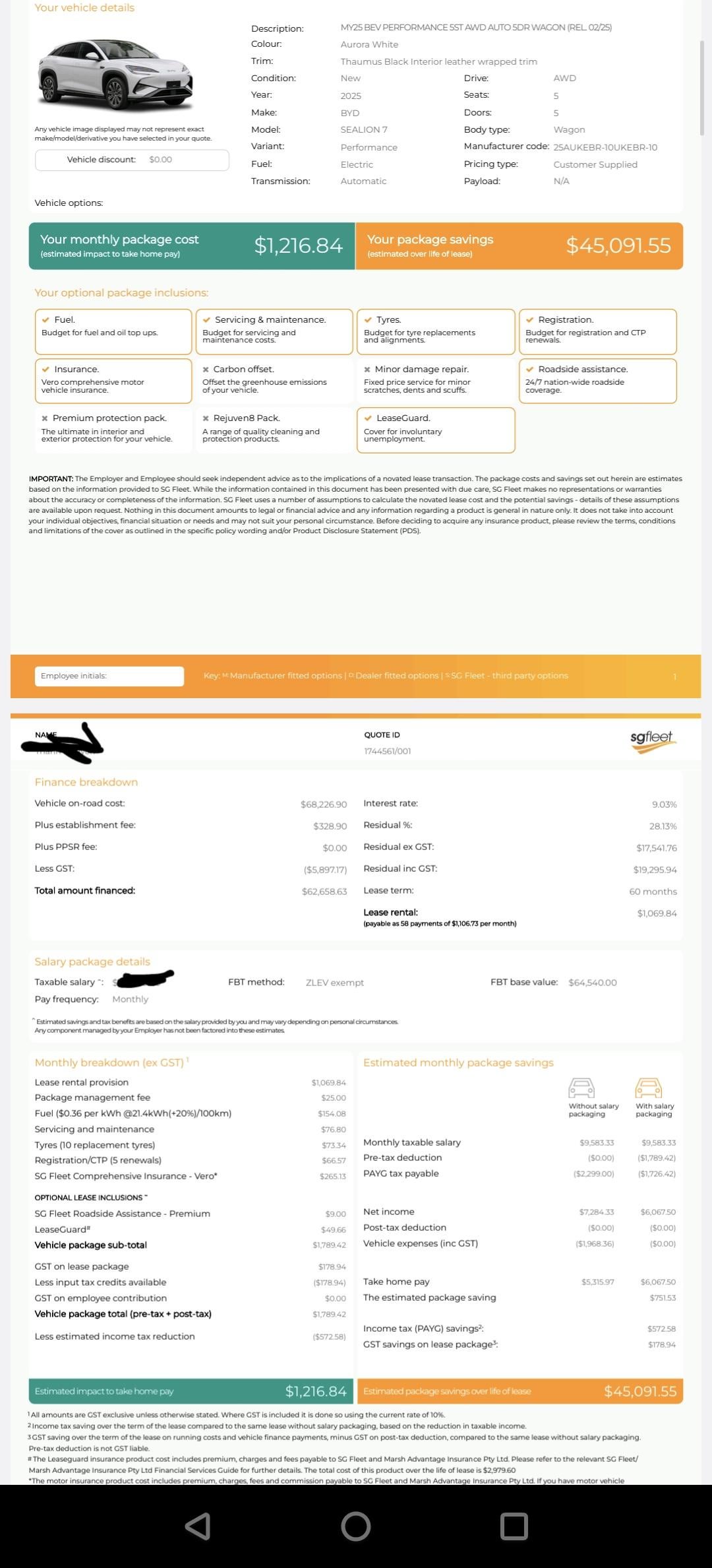 Hi All, Just wondering if the following quote looks okay or not? Will be removing lease guard and roadside assistance Also built in some higher running costs but unsure if the numbers are necessary. Any thoughts would be appreciated.