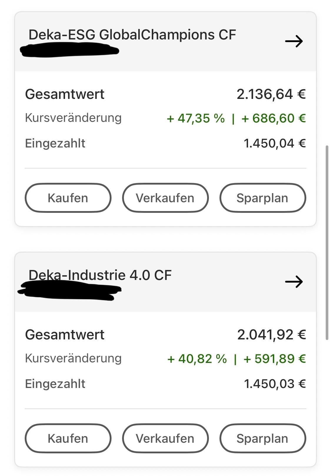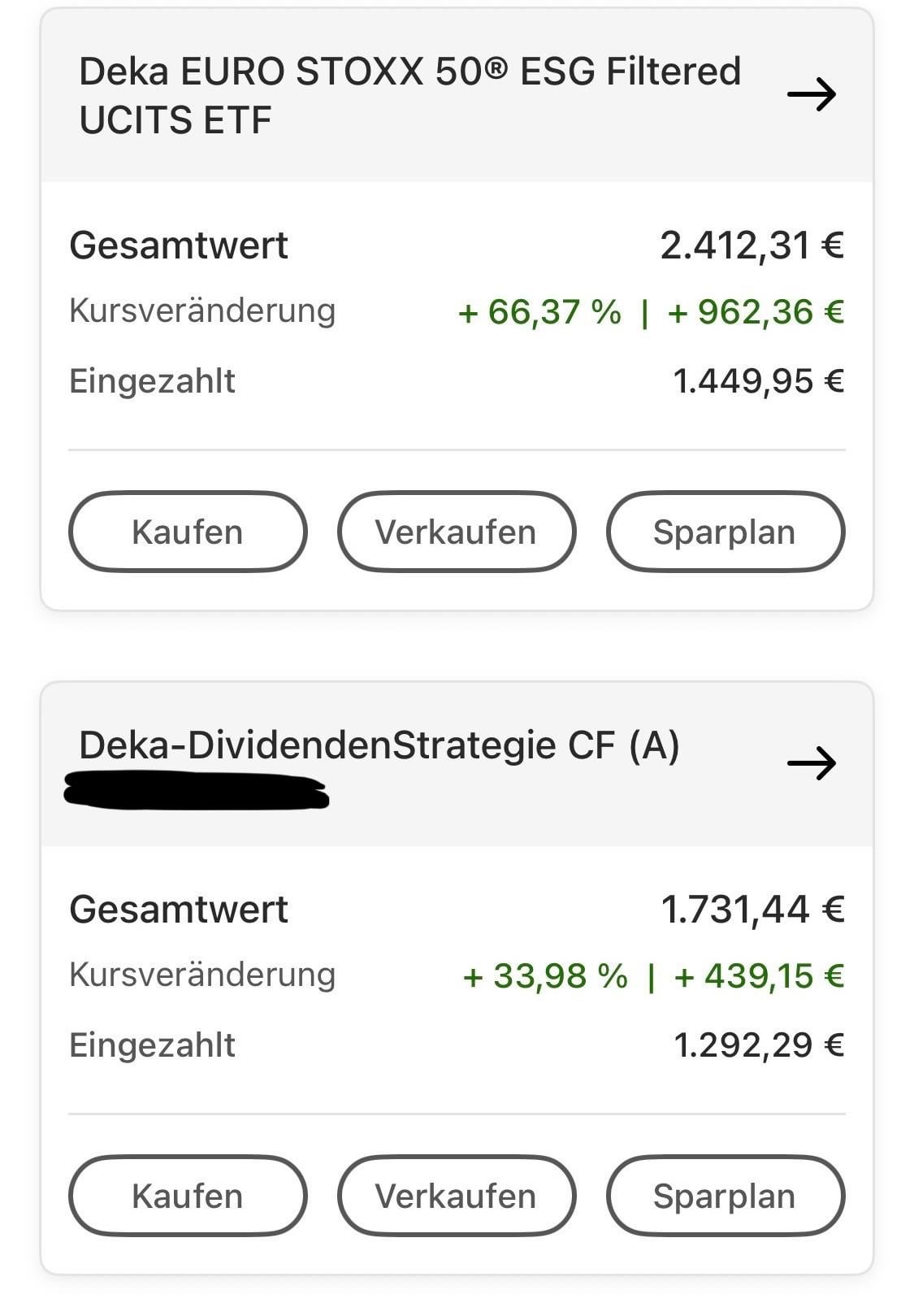 Sind 1.4–1.9% TER (jährliche Entnahme aus fondsvolumen) + 12,50 Depot Gebühren die abgehen von meinem Konto. Letzteres kann ich verkraften (1€ pro Monat, ok) Das Problem sind die hohen Gebühren TER gebühren, 4 aktiv gemanagte Fonds halt, keine ETFS. Wenn der gesamt Betrag höher wird ist das halt schon echt beträchtlich. Denke gehe einfach mal aus allen raus außer dem STOXX Europe 50 ESG und halte den aus psychologischen Gründen. Vielleicht behalte ich auch die Dividenden Strategie, aber so richtig knorke ist die auch net