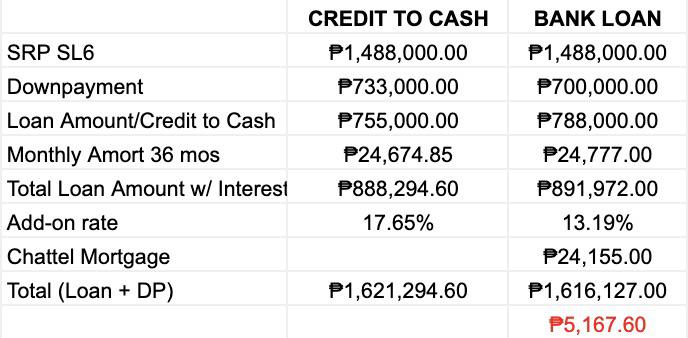 Nagawa ko na din to and credit to cash ang pinili ko for convenience. Pero ang mali sa computation mo is yung promo, usually pag auto loan may promo yan na free chattel, LTO registration, ctpl, and 1st year insurance. Sa end ko ang total is mas mahal ng 40k+ pero mas pinili ko pa din credit to cash for convenience.