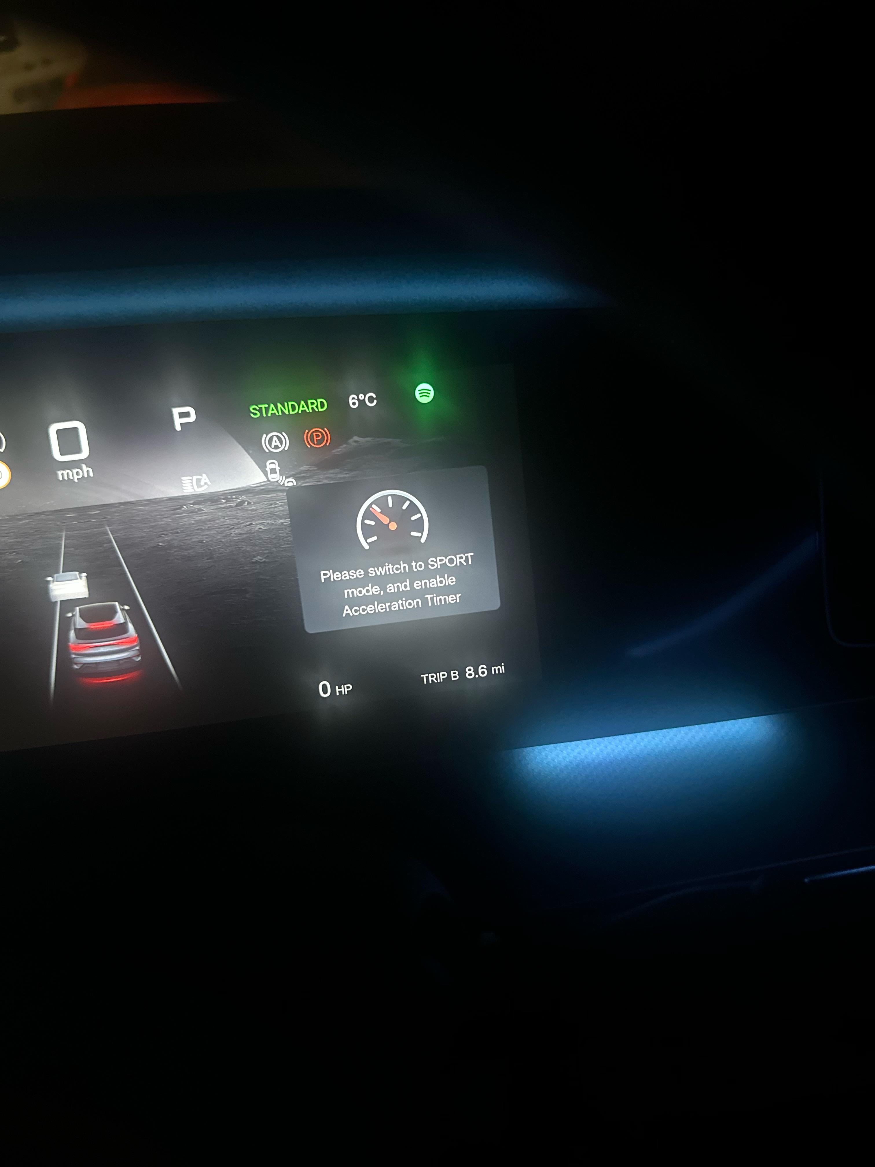 Its really not that complex. Its your 0-100(maybe you can set it to 0-120?) timer. So the moment you take off in Sport Mode which is why its saying switch to it, then the timer starts and it will give your stat's to brag to your mates. These days pretty much an EV will do around the same time so less to brag about. I guess the top Seal does it in 3.8 which is still pretty quick, not sure about Sealion