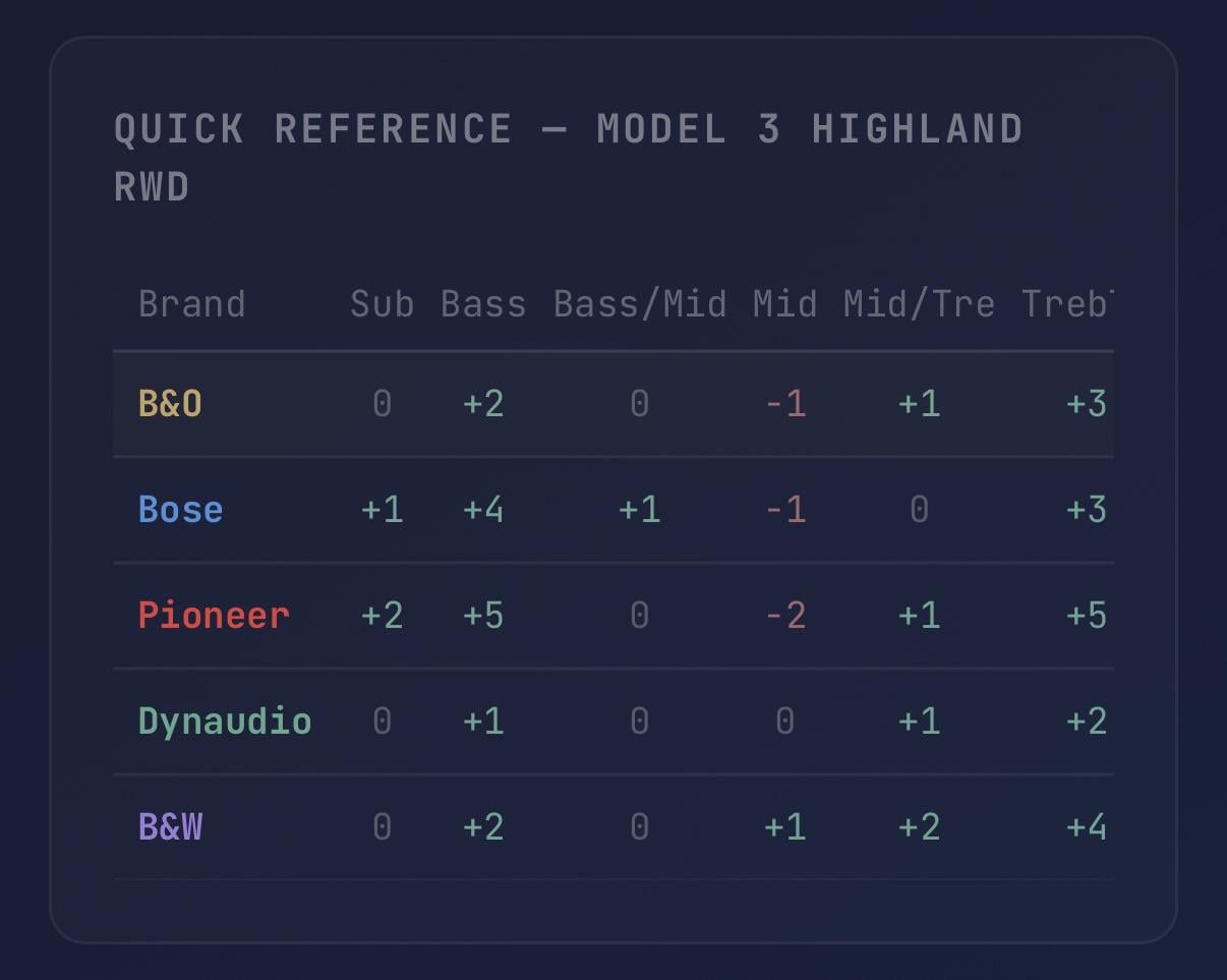 Made an interactive tool with EQ profiles that mimic B&O, Bose, Pioneer, Dynaudio, and B&W on Tesla’s built in EQ. Covers both Model 3 Highland (17 speakers) and Model Y Juniper (15 speakers) with adjusted values for each cabin. Not a perfect replica obviously, but a fun starting point. Let me know what you think