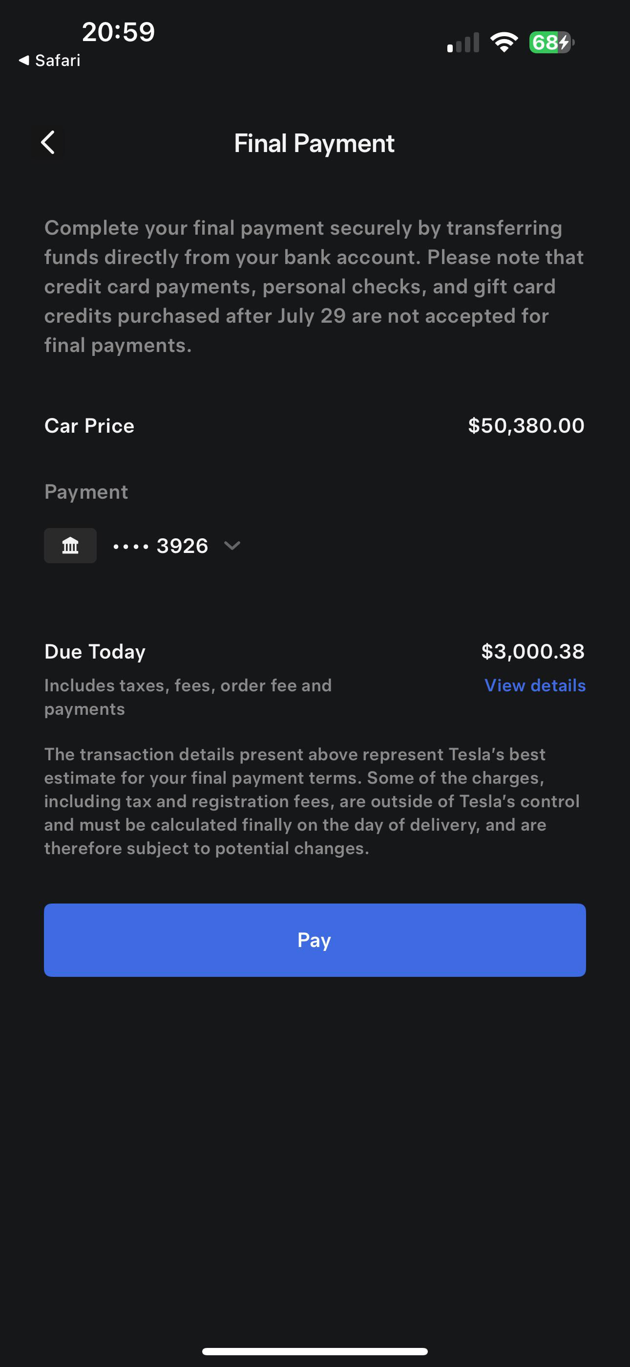 Bank account ACH. Tesla always allow bank account ACH for payments, and particularly the final payment when they don't allow credit card. Or you can wire in.