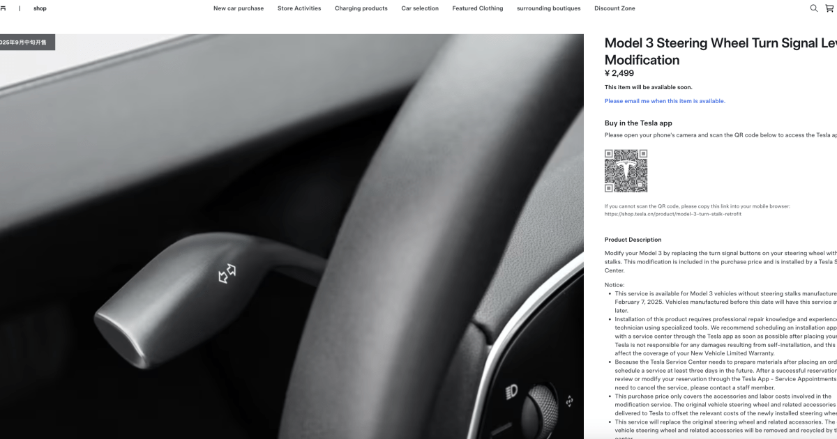 Tesla will sell you back the turn signal stalk it removed from the Model 3 | For now, the retrofit turn signal stalk is only available in China for approximately $348.