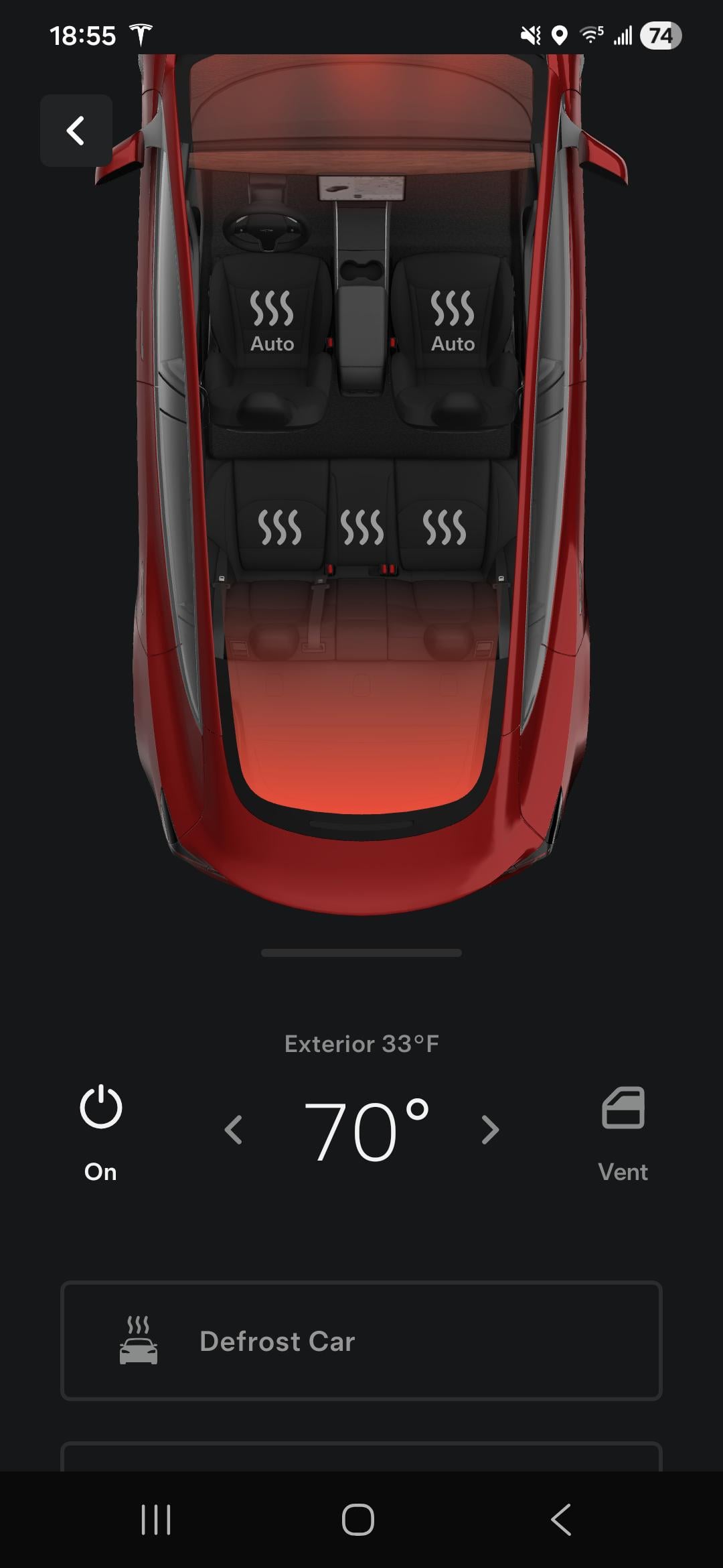 It's my first winter with a Tesla, so excuse the dumb question. Does the glowing red mean that defrost is on, or just that it's blowing heat? I didn't turn on defrost manually (obviously, since defrost isn't highlighted), I only turned on the climate on 70. Thanks