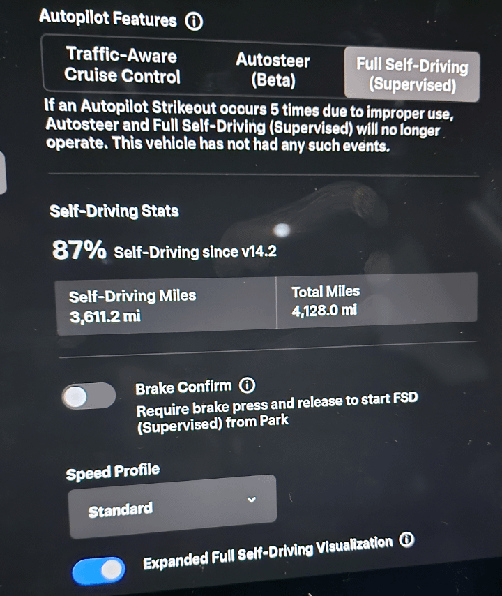 Versus my 2021 HW3 Model 3 where I have to intervene somewhat commonly because it's too unconfident or indecisive, on my 2026 HW4 Model Y, the only time is to take over for potholes. Otherwise, it's near perfect.