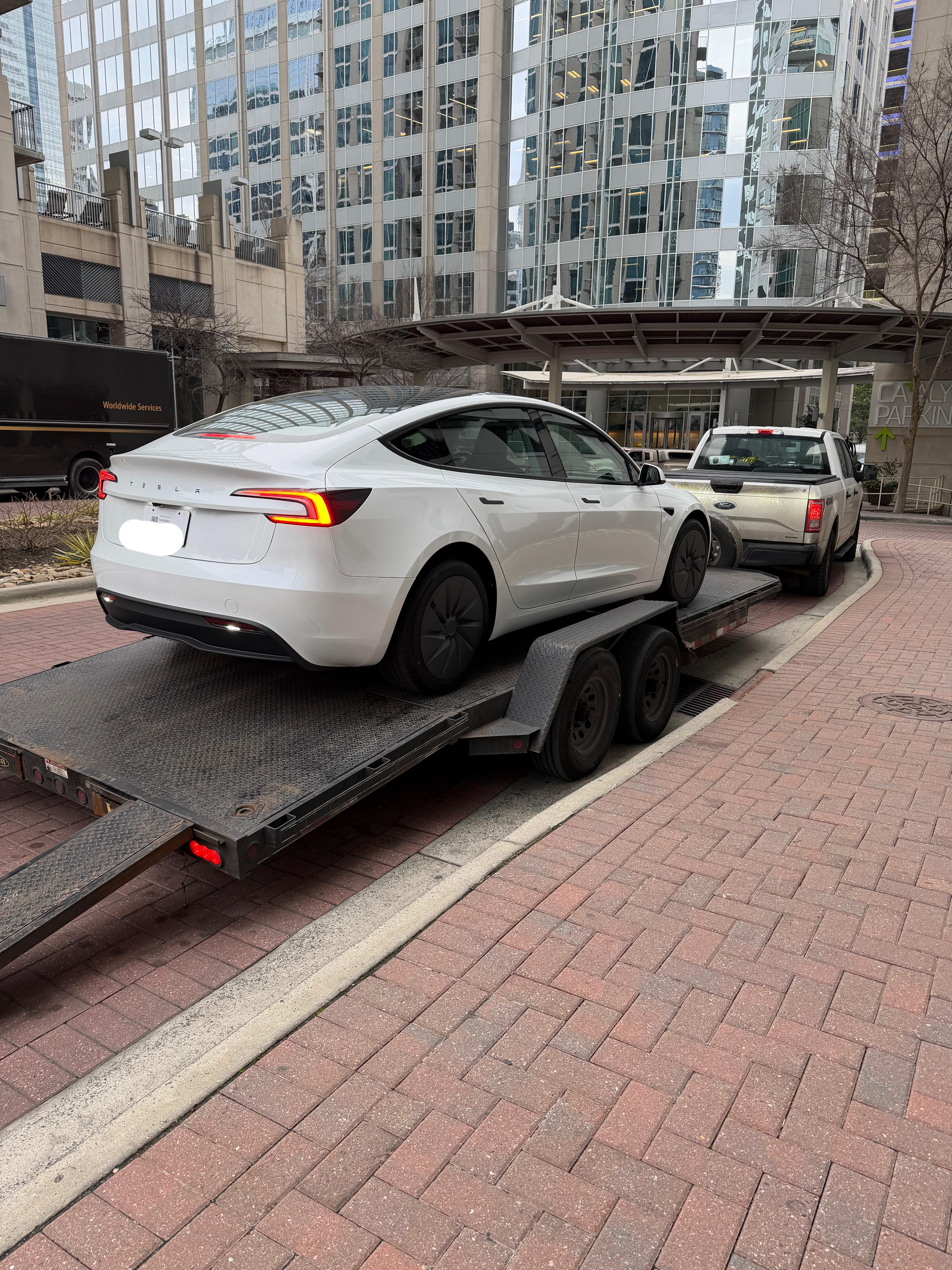 A quick google says a Ford f150 (I am not completely certain it’s that) has a maximum braked capacity of 4500kg. Model 3 weights approx 1800kg. Flatbed might weigh 750kg at the upper end but I doubt it’s that much.