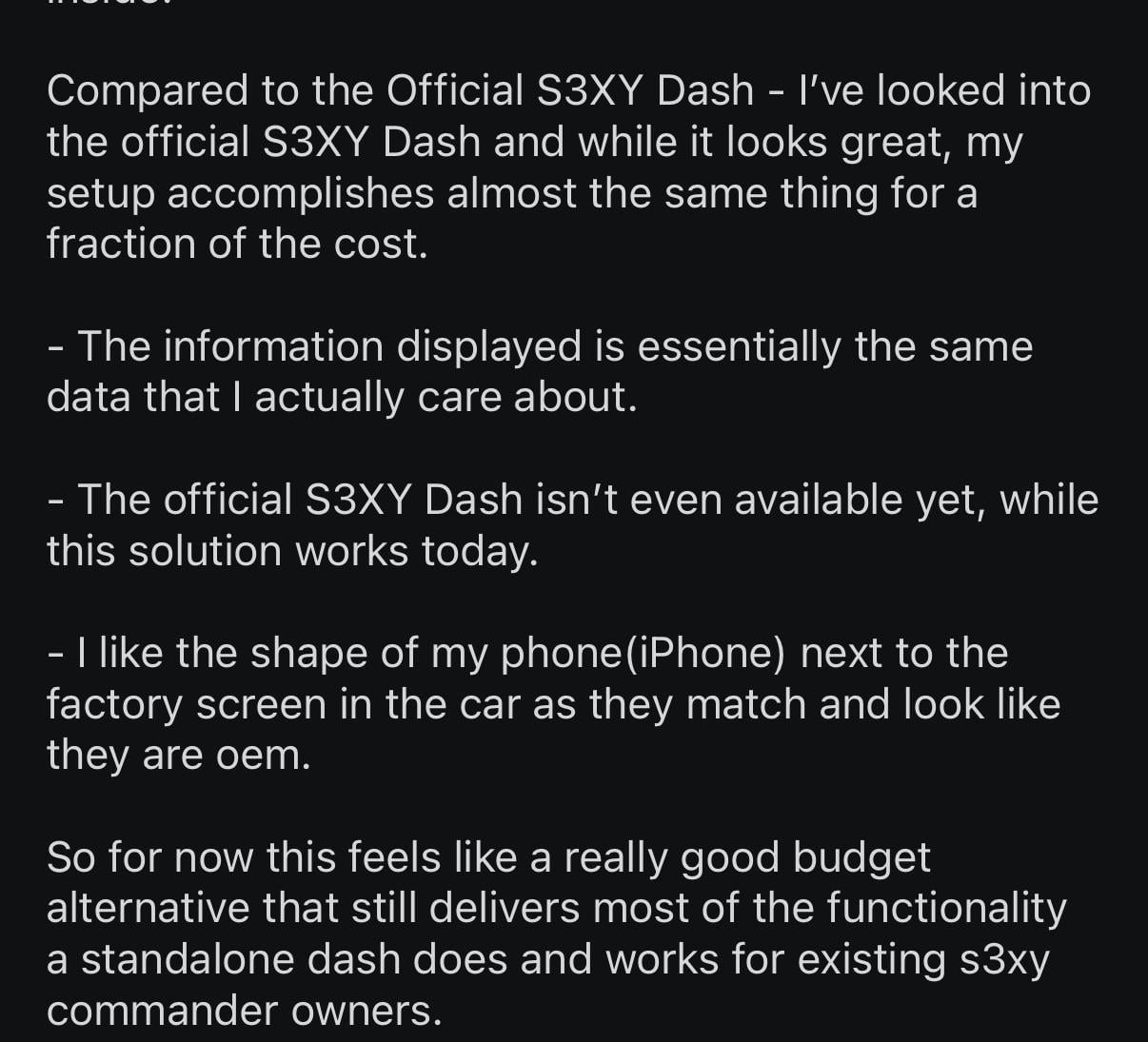 I have my phone using the sexy app connected to a cheap retractable mount I found on Amazon and retrofitted to my car. It serves its purpose well. I also use S3XY buttons and the left stalk, with their commander.