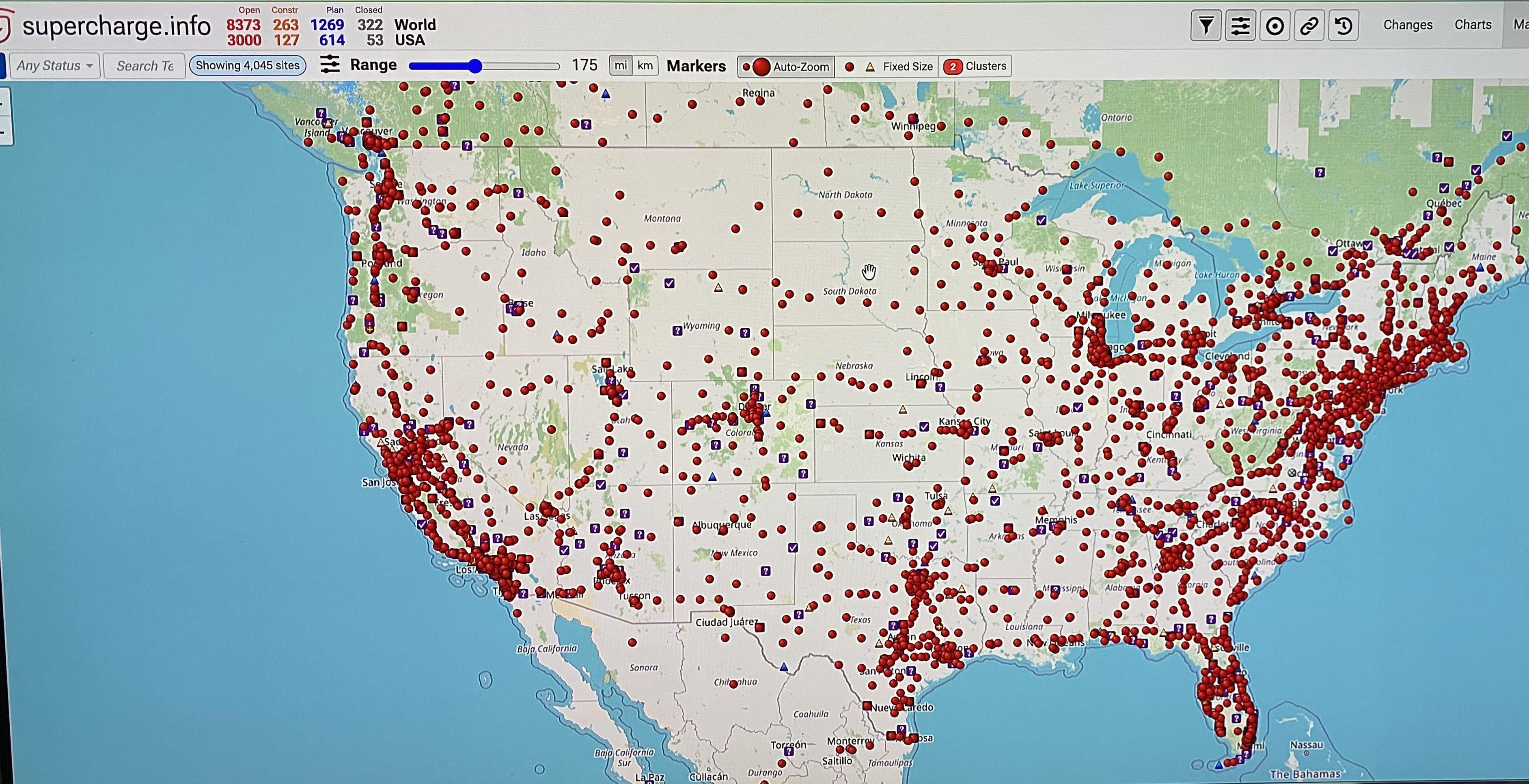 As I understand it, check marks mean a building permit is getting voted on by the local authorities. Question marks mean Tesla has a plan for a station there, blue triangle means permits have been acquired, orange triangle means under construction. Someone who knows better can correct this, but it’s quite interesting to watch this buildout happen over time. Supercharge.info is a great resource for more details. I use it in conjunction with PlugShare when I’m looking at taking a longer trip.