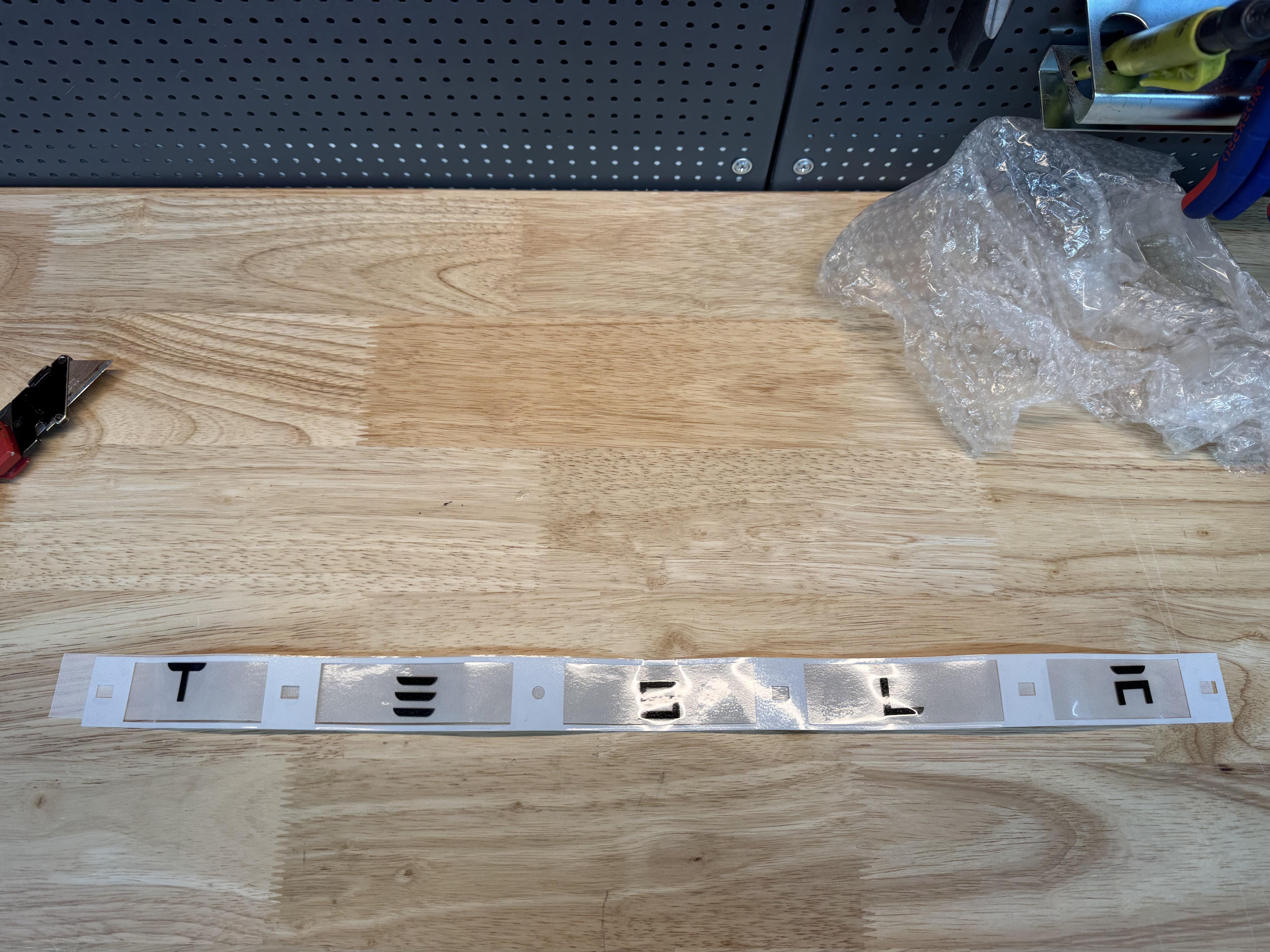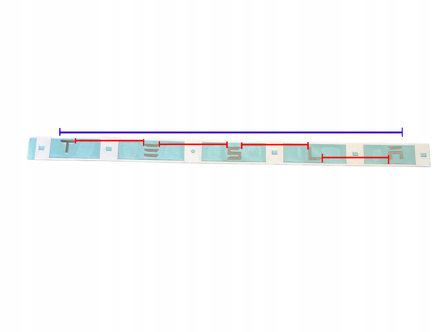 I bought the replacement black OEM rear badge for my Highland. The problem is that I removed the old letters before opening the package with the new badge. And I notice that the distance between each letter is not correct, they probably lost their place in shipping. I am following the [official Tesla documentation](https://service.tesla.com/docs/Model3/ServiceManual/2024/en-us/GUID-EFEDB06D-7CA7-4BE9-9135-6000005C91C0.html) to do this, but without the correct spacing it won't help. **If anyone of you guys could help me to measure the distance between each letter (shown in red), and the total length (shown in blue) it would be amazing!** I would really appreciate it!