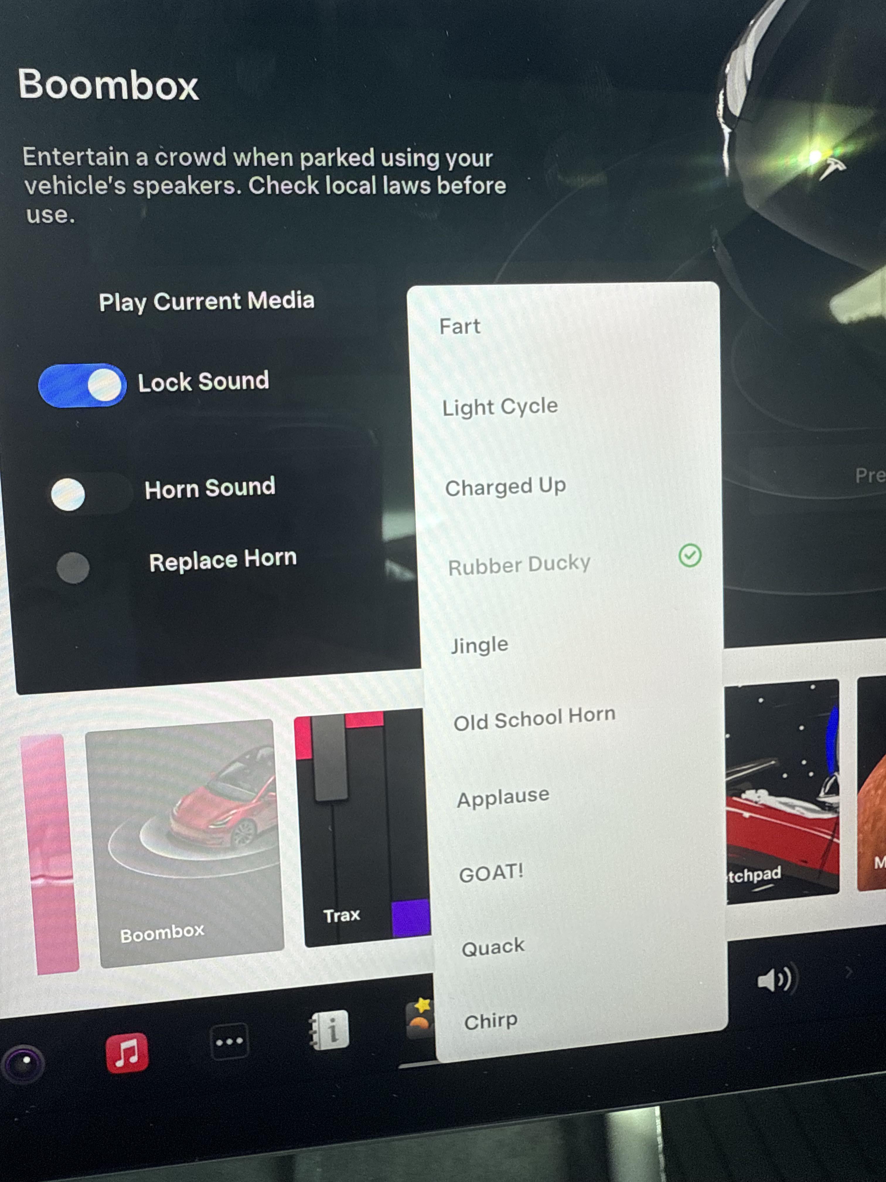 https://preview.redd.it/gl8jqmiuehmg1.jpeg?width=3024&format=pjpg&auto=webp&s=8404a91959be12ac786f7f82210c0614964fa11b In the toy box thing (not settings). I think it’s called boombox. It wasn’t in my 2018 model 3 (that I had for the past 7 years)… I’m not sure when the outside speaker got introduced.