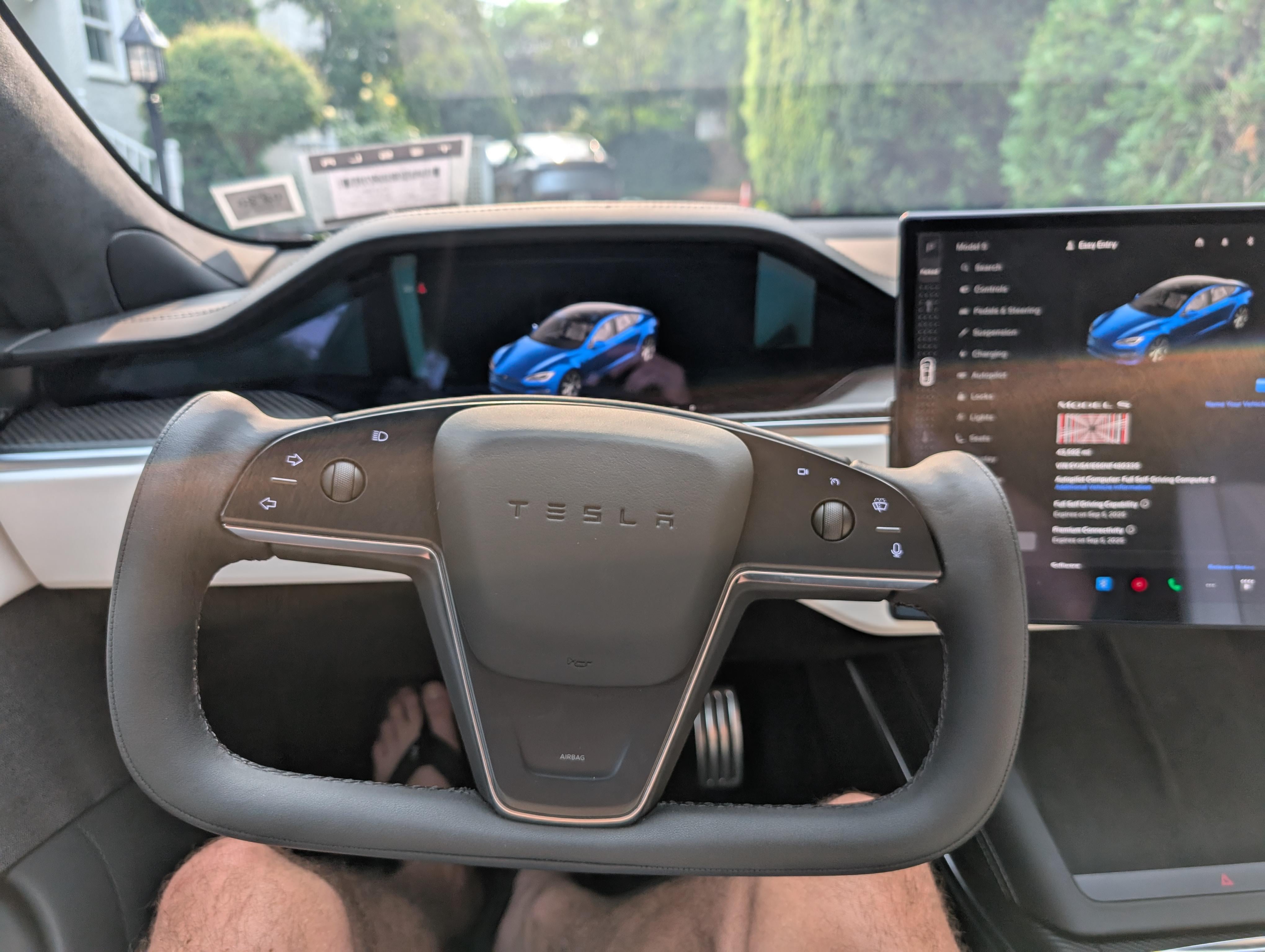 Having the top part of the steering wheel removed helps to see the gauge cluster, but Tesla’s don’t have gauge clusters so what’s the point