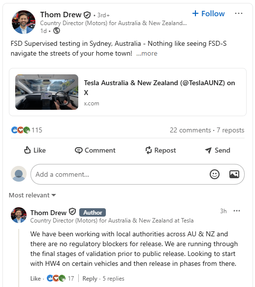 Thom Drew (Director for Tesla Aus & NZ) states FSD is imminent for a public release in Aus & NZ (RHD)