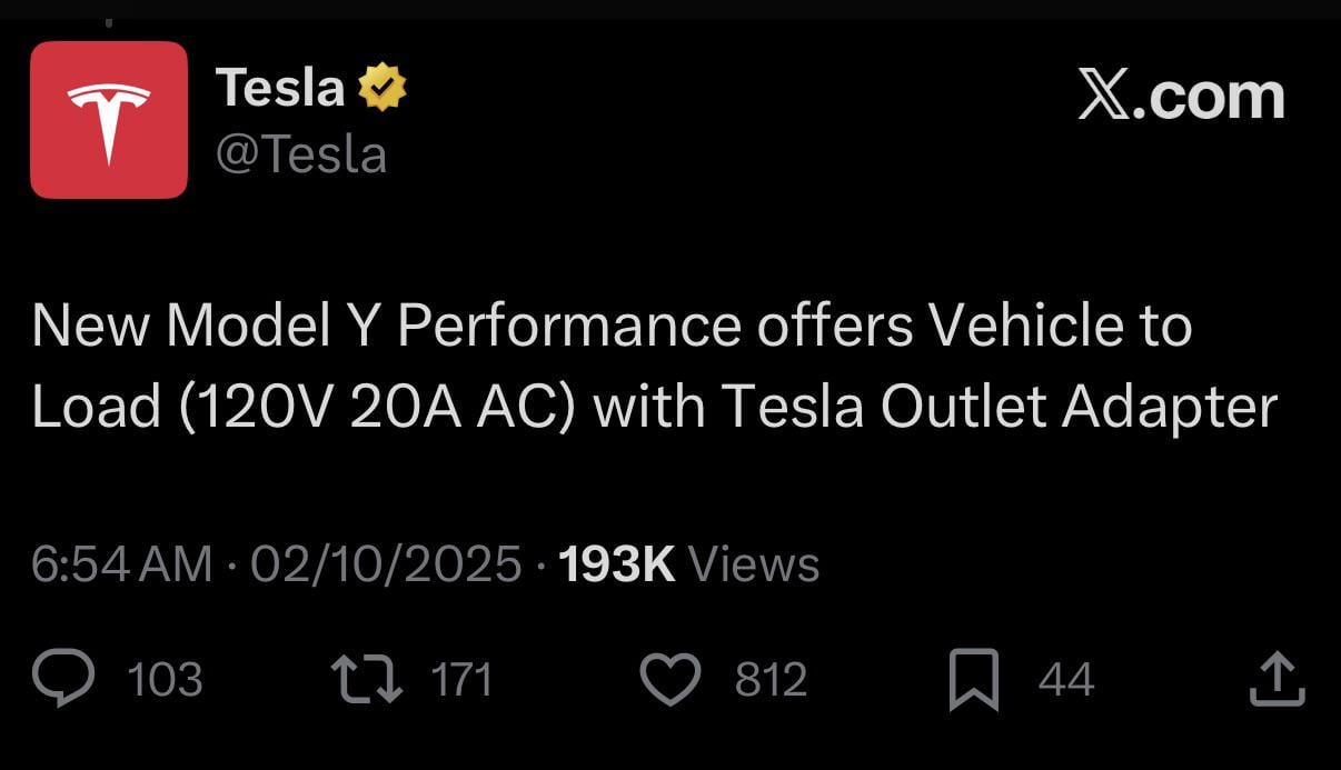 Interestingly, the Tesla account only mentioned V2L, but the tweet it's responding to mentioned V2H as well. It also mentions an OTA update, but doesn't clarify if it's performance only or older Junipers too