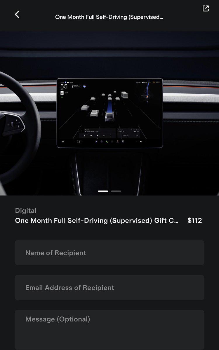 A new “One Month FSD (Supervised) Gift Card” is now live in the Tesla app, allowing U.S. owners to gift a month of FSD (Supervised). It’s priced at $112, including up to 13% sales tax, is a final sale, and can be redeemed for FSD or other eligible Tesla services. Shop Now: [https://shop.tesla.com/product/one-month-full-self-driving-\_supervised\_-gift-card](https://shop.tesla.com/product/one-month-full-self-driving-_supervised_-gift-card)