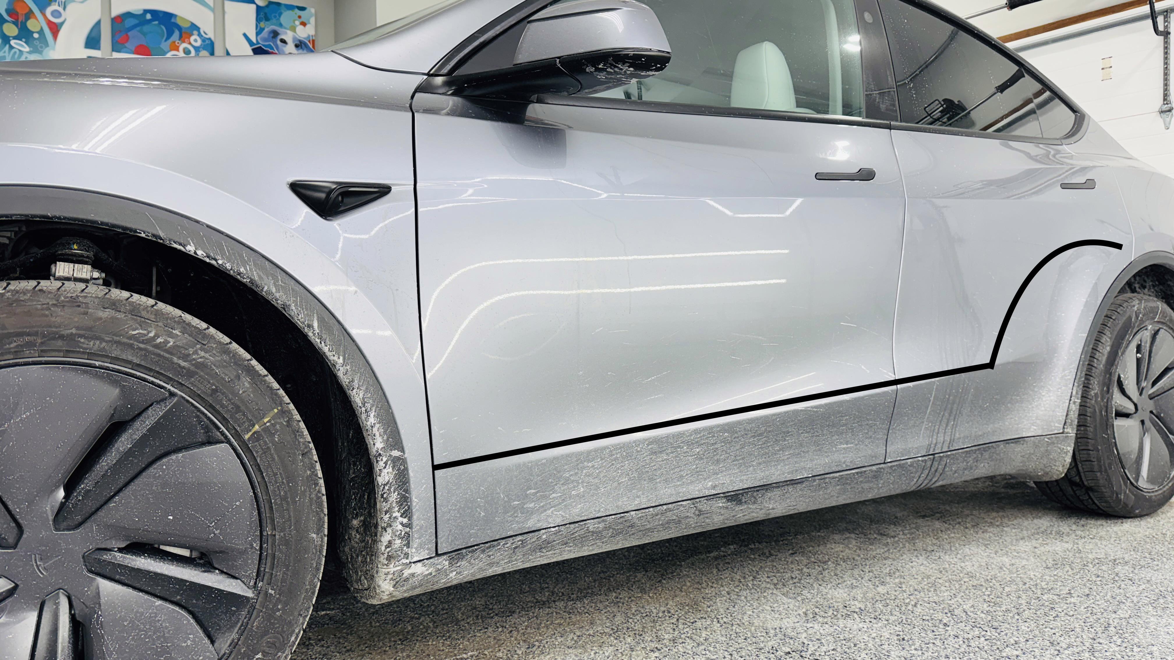 Had our MY covered in Xpel PPF. The entire front end, A pillars and the extended lower portion. I marked up the pic with the black line. Essentially the PPF covers the lower area from the door crease down. Then on the rear door, you get a huge dog leg. You can see where the front wheel splats on the paint. I was surprised how much debris/ salt hit the dog leg. It's the perfect amount of coverage. I'm not a huge fan of mud flaps, which is why I chose the extended lower coverage.