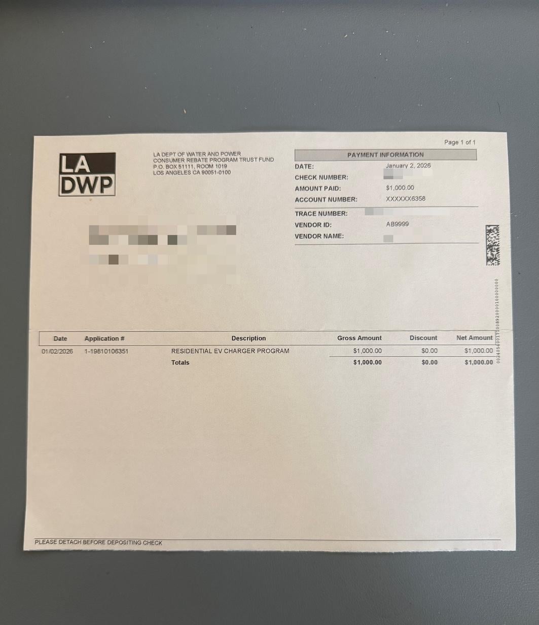 I’m in the Los Angeles area and recently received the EV charger installation rebate from LADWP. The whole process took about 3 months and was honestly smoother than I expected, so I figured I’d share my experience in case it helps someone else. Before installation, I bought a Tesla Wall Connector for Model Y. The chargers supported by the LADWP rebate program are listed here: [https://www.ladwp.com/residential-services/programs-and-rebates-residential/electric-vehicles/residential-ev-charger-rebate-program/qualifying-product-list](https://www.ladwp.com/residential-services/programs-and-rebates-residential/electric-vehicles/residential-ev-charger-rebate-program/qualifying-product-list) ***Sept 6, 2025 - Permit*** Applied for the **LADBS Express Permit** online: [https://permitla.lacitydbs.org](https://permitla.lacitydbs.org) I chose Level-2 charger installation, no separate EV meter. My house already has a **200A panel**, so no panel upgrade was needed, just to add a 60-amp breaker on the panel for the electric vehicle charger. No plan check or ESR visit required. Paid $98, and the permit showed up in my email within a day. ***Sept 7\~10 - Electrician quotes*** Called a few licensed electricians found on Google and sent them floor plan + photos. Quotes ranged from $1,000 to $4,000 with similar installation plans. Notes: * LADWP requires a **licensed electrician** for the rebate. * Tell them upfront you need to pass LADBS inspection and qualify for LADWP rebate. I went with an electrician quoting $1,000 including labor and materials. He had shown me his previous charger installations and had good experience with LADWP/SCE incentive programs before. ***Sept 13 - Installation day*** My electrical panel is at the back of the house and the garage is in the front. The wire run ended up being about **100 feet**, longer than expected. So the install took over 5 hours and the final cost was **$1,250**. The installation was clean and well done: [charger photo](https://imgur.com/a/QtcCzLu) and [breaker panel photo](https://imgur.com/a/aift9Dg). ***Scheduling inspection*** Scheduled inspection online: [https://dbs.lacity.gov/services/inspection](https://dbs.lacity.gov/services/inspection) You can pick the **day**, but not the **time window.** You won't be told the exact inspection time until that day so you basically need to stay home that day. ***Sept 22 - First inspection*** Got an automated call around **8am** saying the inspector would come between 1–4pm. Inspector showed up around 3:30pm, checked all the wires and connections quite carefully, pointed out a few corrections, and explained to me what he expected (I could not understand half of them but I took the note). Later that evening I got a PDF listing the corrections. Called my electrician and he came back about two weeks later to fix them. ***Oct 27 - Second inspection*** Scheduled another inspection. Same automated call in the early morning with a 3–4 hour window. Inspection passed. ***Oct 29 - Rebate submission*** Uploaded documents here: [https://www.ladwp.com/residential-services/programs-and-rebates-residential/electric-vehicles/residential-ev-charger-rebate-program](https://www.ladwp.com/residential-services/programs-and-rebates-residential/electric-vehicles/residential-ev-charger-rebate-program) There was **no confirmation email or reference number**, which made me unsure if it went through. I thought to resubmit if I didn’t hear back in 3 to 4 months. Documents submitted: * Electrician invoice * Charger purchase receipt * Permit + final inspection report (from LADBS permit status page) ***Jan 5, 2026 - Rebate check arrived*** A letter from ladwp with a $1,000 check inside showed up in the mail box. https://preview.redd.it/5c7zno8weeig1.jpg?width=1063&format=pjpg&auto=webp&s=26ce3b5ac92db0a98f40a9e7db05db17670a700b Voila...about 2 months after submission, and roughly 4 months total from permit to rebate. ***Things to know before starting*** * Inspection scheduling basically means **stay home all day** * Electrician pricing varies a lot, so get multiple quotes * The rebate submission site doesn’t send confirmation emails * Failing the one or two inspection isn’t a big deal. The corrections are meant to ensure safety and code compliance. Just make sure your electrician is willing to come back and fix things. Mine did and didn’t charge extra.