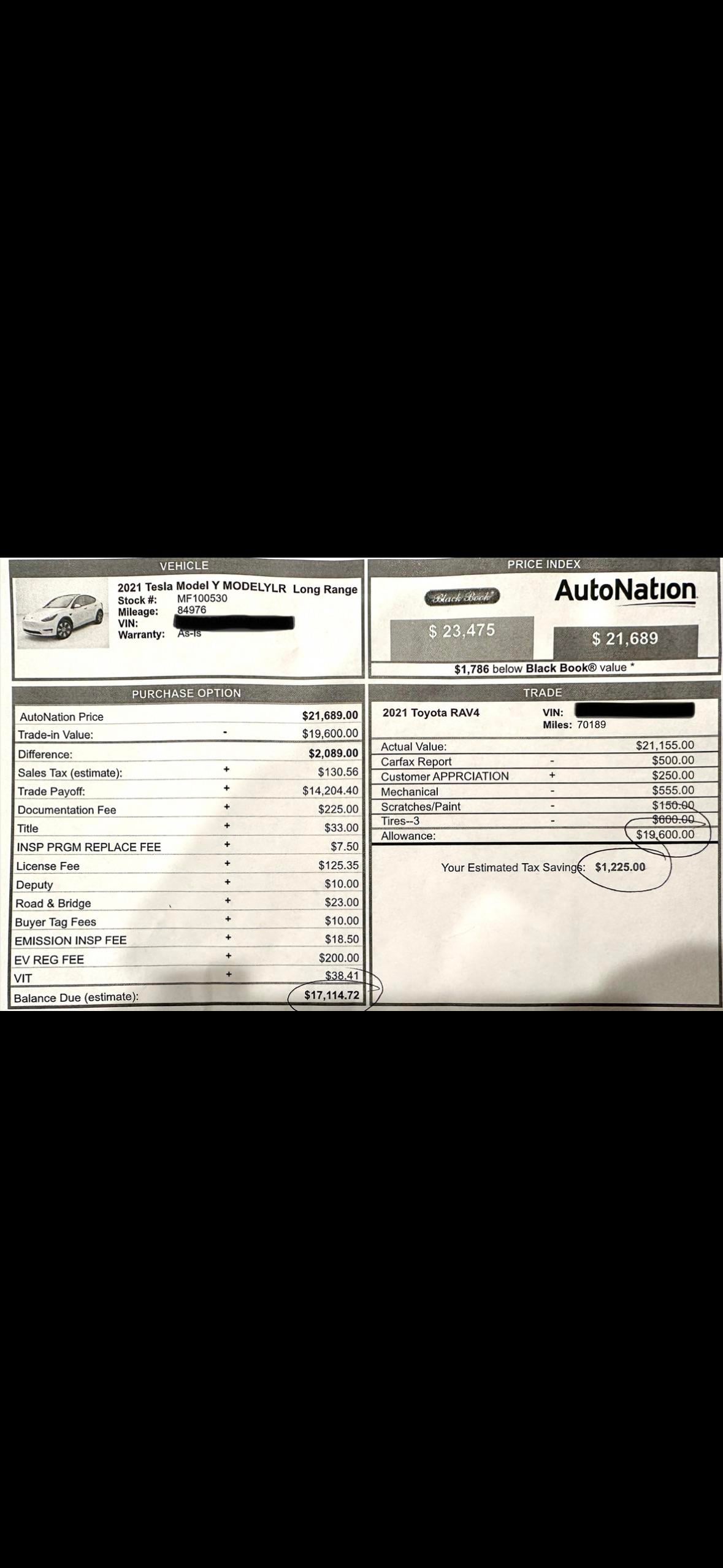 I have a 2021 model Y AWD (41750 miles) which i will be soon upgrading. Tesla is offering me $20400, Carmax around the same. Carvana offering is $23700