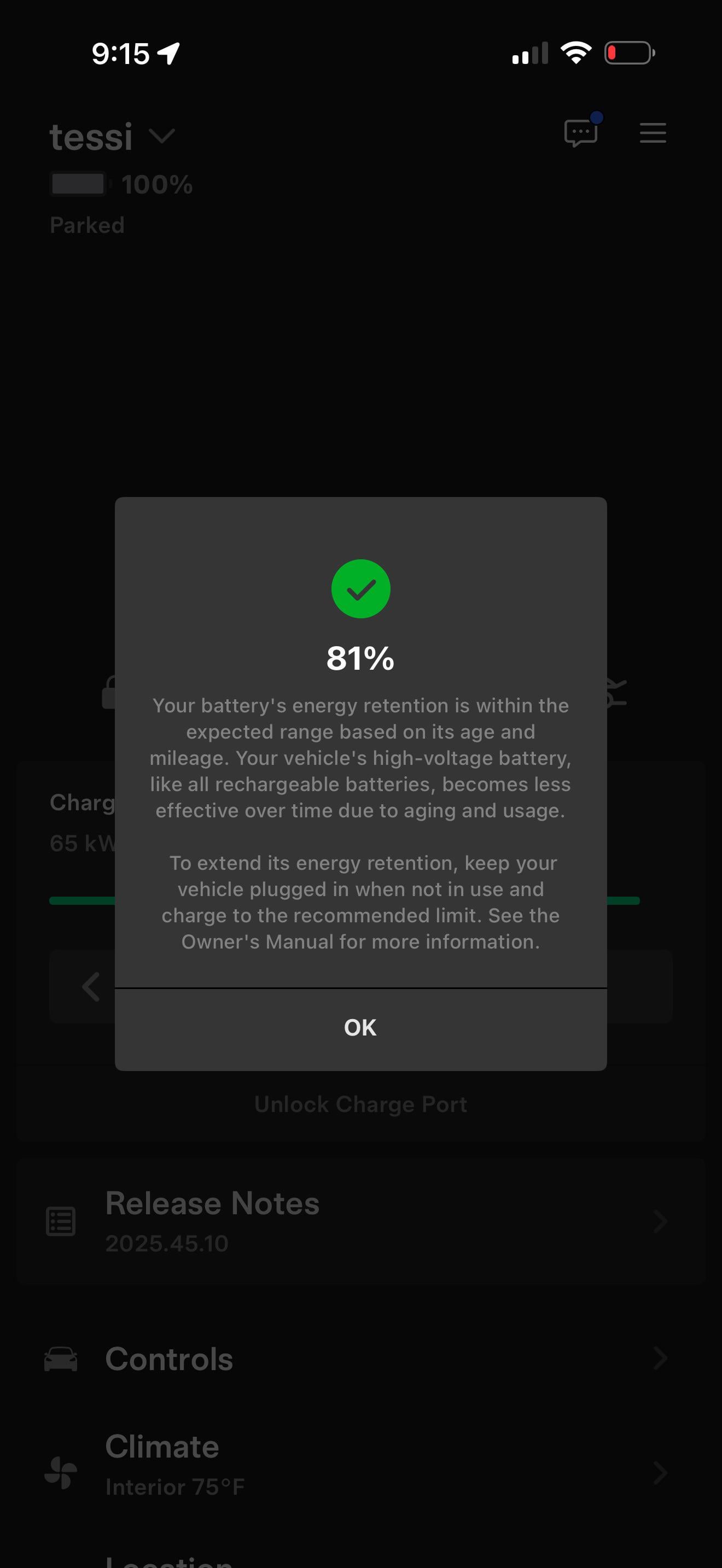 Ok, so 197 miles at 80% means 245 miles at 100% which is 80.7% of original capacity So, the battery test you did agrees almost within 1% point of what the screen shows Good to know (for me) because I don't want the hassle of that actual battery test 👉 Thanks for the info ✅ ---- My 2023 MYLR started as 326 mile range. Now after 40k miles, it shows 177 miles at 60% So full range is 295 and battery capacity is at 295/326 = 90% My daily usage is 20 miles so I keep the battery between 50% and 25% Only for weekends I charge to a bit more. Like it's 60% now But if your daily use is more than 100mile , then keep charging it daily to 80%