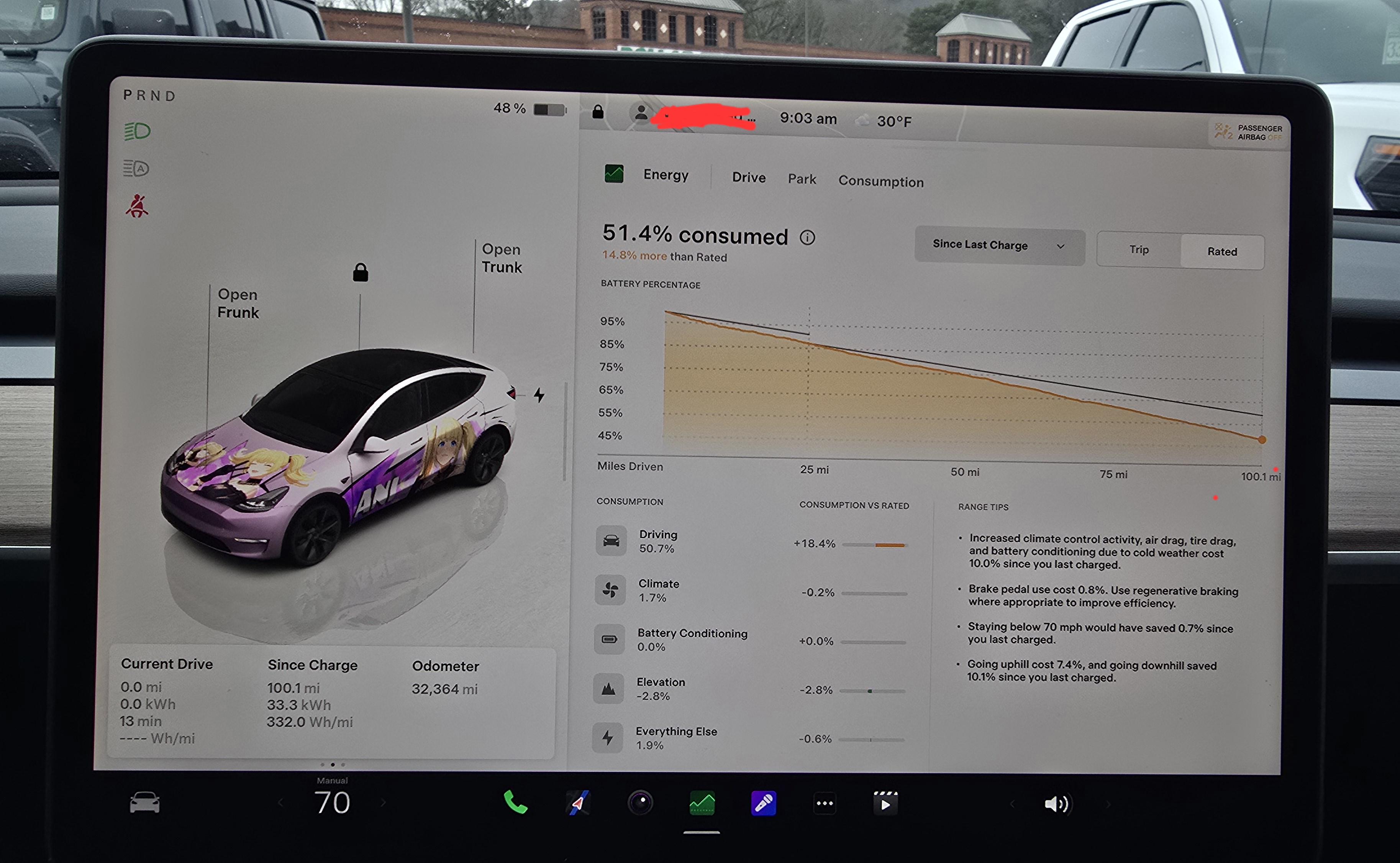 Cold weather = range eater 100 miles and down 30% ain't bad, tbh in 27-degree weather. 100 miles and down 10% in summer time makes more sense, though. But... you aren't driving in summer... Soooo... why are you complaining?