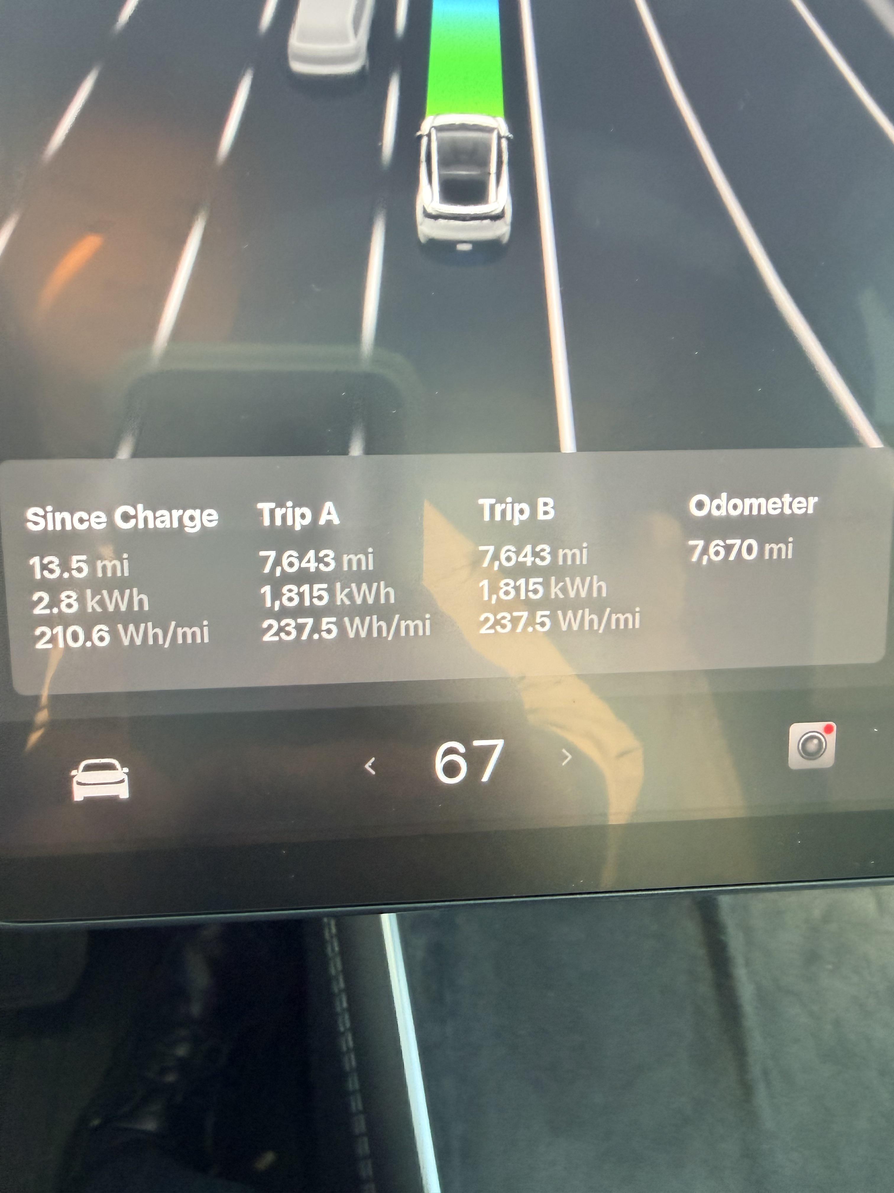 I don't have mine yet but from those numbers it looks like great efficiency if I'm understanding the numbers correctly. Since charge you're using 2.8 kWh to go 13.5 miles = 4.8 miles/kWh. Based on the trip odometers you're averaging 4.2 miles/kWh. Assuming 74 kWh of capacity, your range is about 311 miles. I hope I get close to that but given my driving conditions I'm expecting closer to 280 real world, much less between charges since I plan on keeping it between 20% and 60% charged as much as possible. My current plug-in hybrid barely manages a paltry 2.8 to 3.0 miles/kWh at best. It's usually closer to 2.5. BTW, I've looked through the manual but I can't find a way to get the car to display the mile/kWh reading. Am I missing something or does the car not have this particular gauge? And if it doesn't, does anyone know of a 3rd party app that has it? It's easy enough to calculate using the miles driven/kWh but it would be much easier to just open an app and have it instantly available without having to do math.