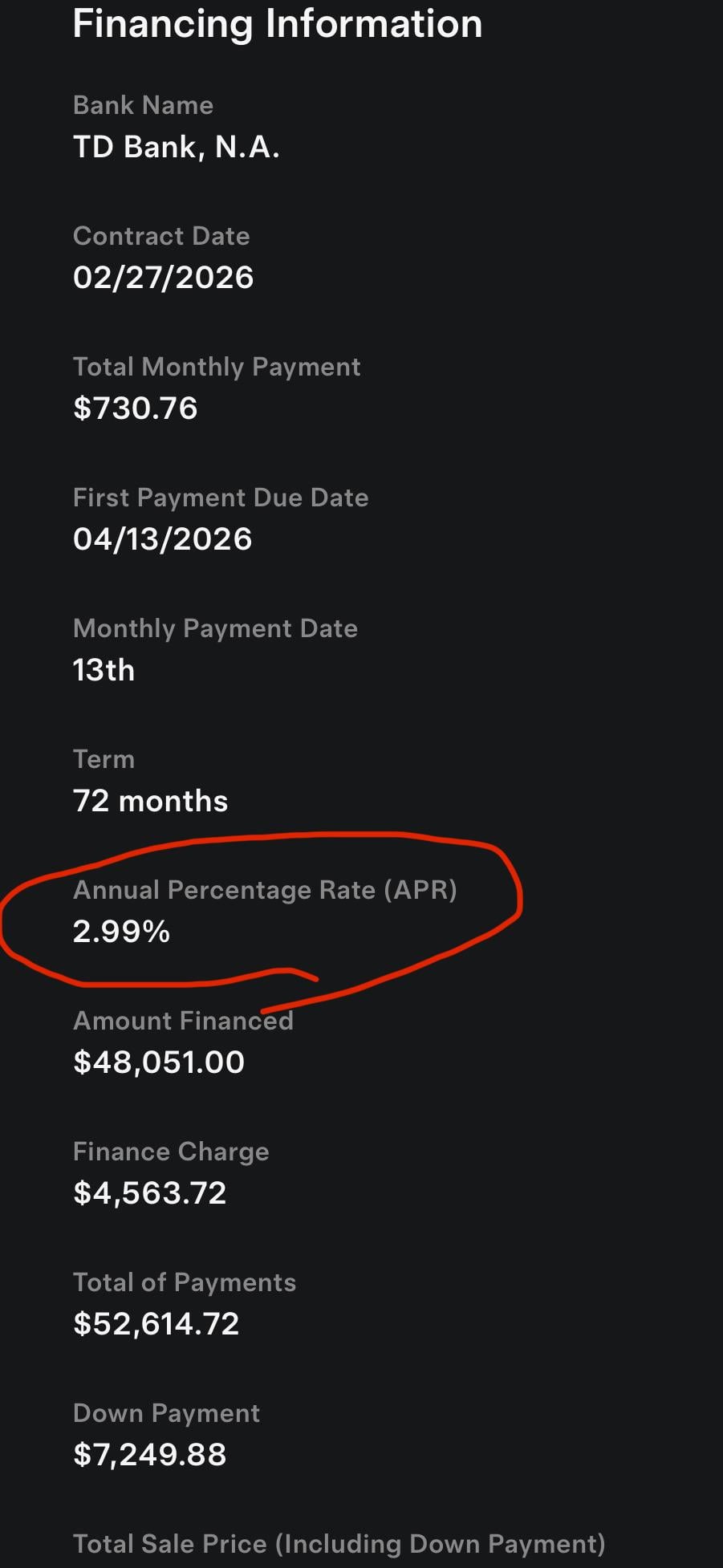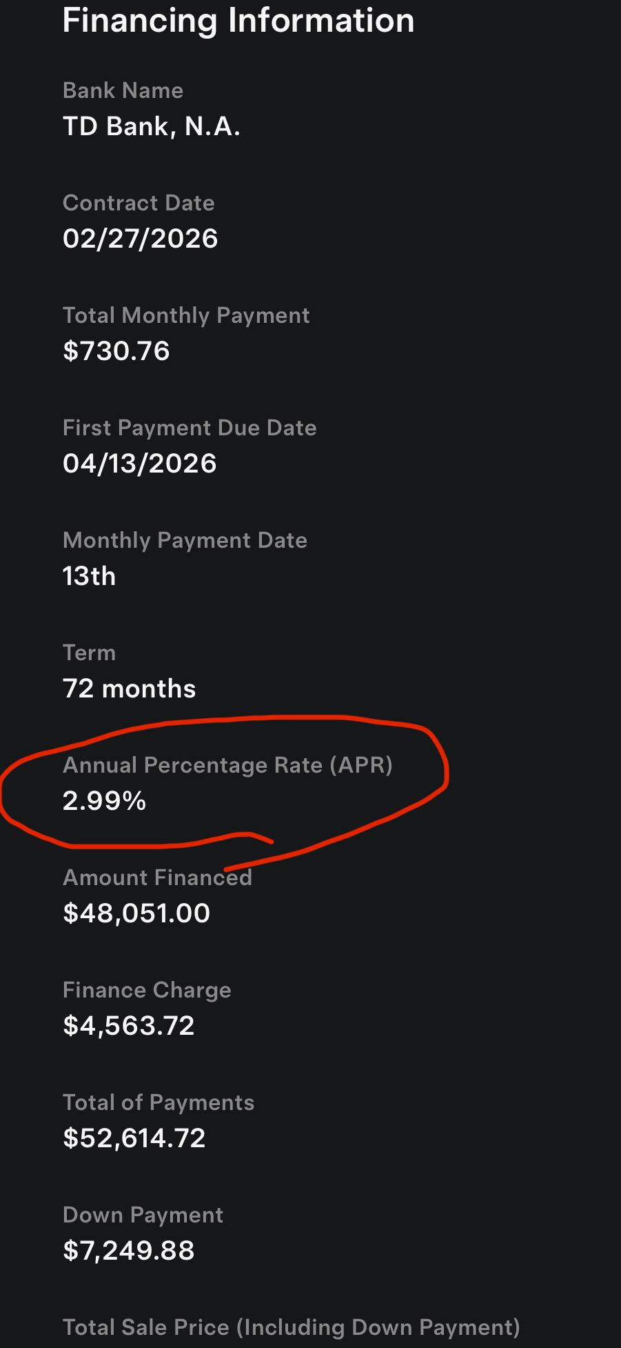 My delivery date is tomorrow, and I did accept the 0.99% APR. Then step 8 out of 9 said to review my agreement, and guess what I found out — the APR had suddenly changed to 2.99%. I contacted them, but make sure you guys check your APR before your delivery. They might have sneakily changed the APR without telling you, even after you accepted a lower rate.