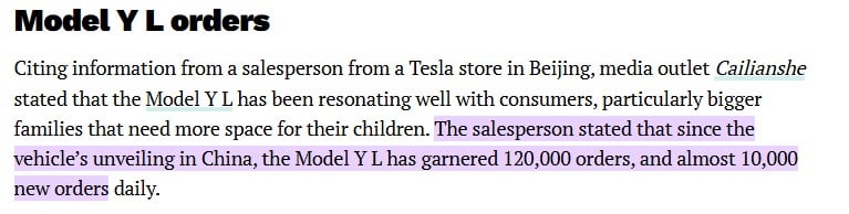 Are there many families in China with more than two kids... who can afford this $48,000 (usd) vehicle? (price converted from Chinese Yuan to USD) >The five-seat SUV Model Y registered 10,340 units last week, \*\***the six-seat SUV Model Y L registered 850 units\*\***, and the Model 3 sedan registered 6,060 units. >Tesla [launched the Model Y L](https://cnevpost.com/2025/08/19/tesla-launches-model-y-l-china/) in China on August 19 and [announced on September 2](https://cnevpost.com/2025/09/02/tesla-begins-model-y-l-deliveries-china/) that deliveries for the model had commenced. >Customers who order the Model Y L now are expected to receive deliveries in November, according to Tesla China's website. [https://cnevpost.com/2025/09/23/china-ev-insurance-registrations-week-ending-sept-21-2025/](https://cnevpost.com/2025/09/23/china-ev-insurance-registrations-week-ending-sept-21-2025/) (I added the stars) So for the week ending 9/21, they only delivered 850 model Y Ls. With deliveries for new orders now pegged to November, that means they have about 6-9 weeks of orders. Let's optimistically say they're planning to boost output and double model Y L delivery numbers to 1700 units per week starting next week. That would mean they have a log of 10,200 - 15,300 orders as of today. In no world do they have 120,000+ orders for this model Y L trim. **Anyone saying this is blatantly lying.**