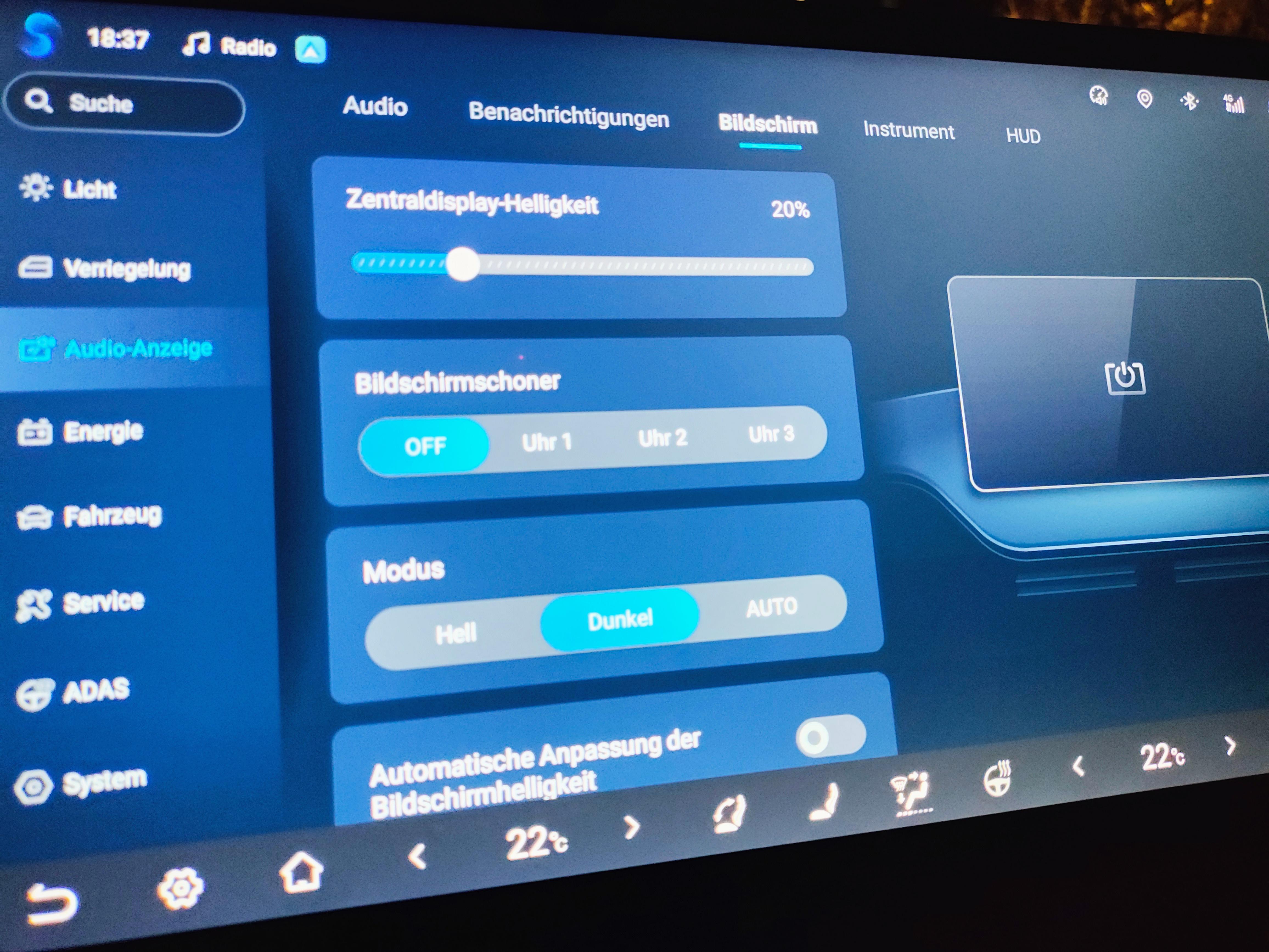 Central display brightness is not set to automatic adjustment. I actually set it up to 20%. This setting will reset itself to 100%. I cannot reproduce after how many hours, or what is causing the reset. I just set it back to 20%, 30 minutes ago. Went shopping came back to the car, and it's still on 20%. For some reason I'm 100% sure Tomorrow, for some reason it will go back to 100% brightness. Anybody faced this problem? I will update what happens if I drive to work tomorrow morning when it's daytime. As I said automatic adjustment is deactivated, so daytime at night time shouldn't influence the reset. If yes it might be a bug