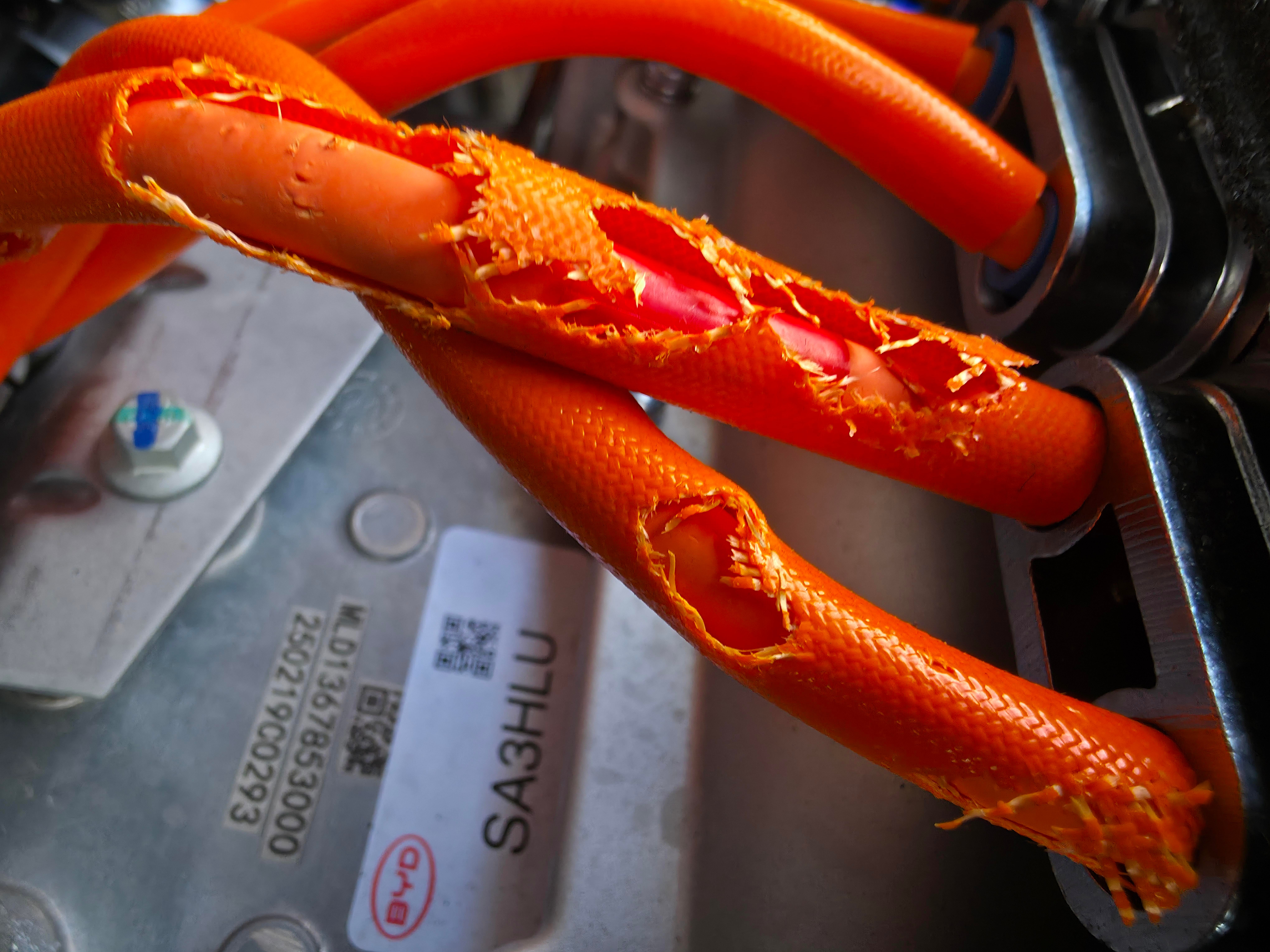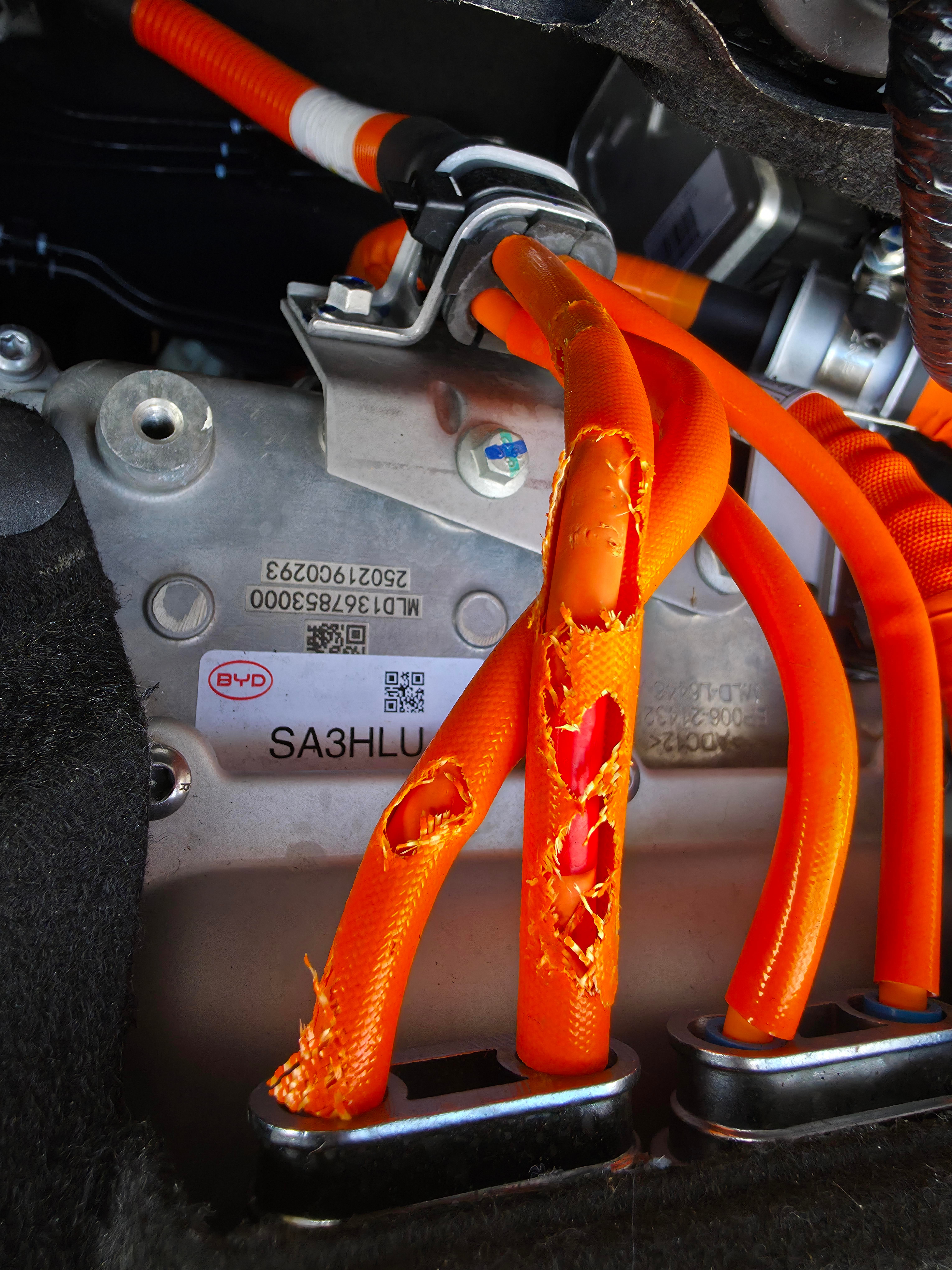 I don’t know what, but something eat it... When I picked up the car, it didn’t occur to me to check under the hood. When I drove it home, I saw chewed wires and reported it immediately, within the first 24 hours after taking delivery. So make sure to inspect your cars carefully, because this most likely happened in the BYD parking lot...