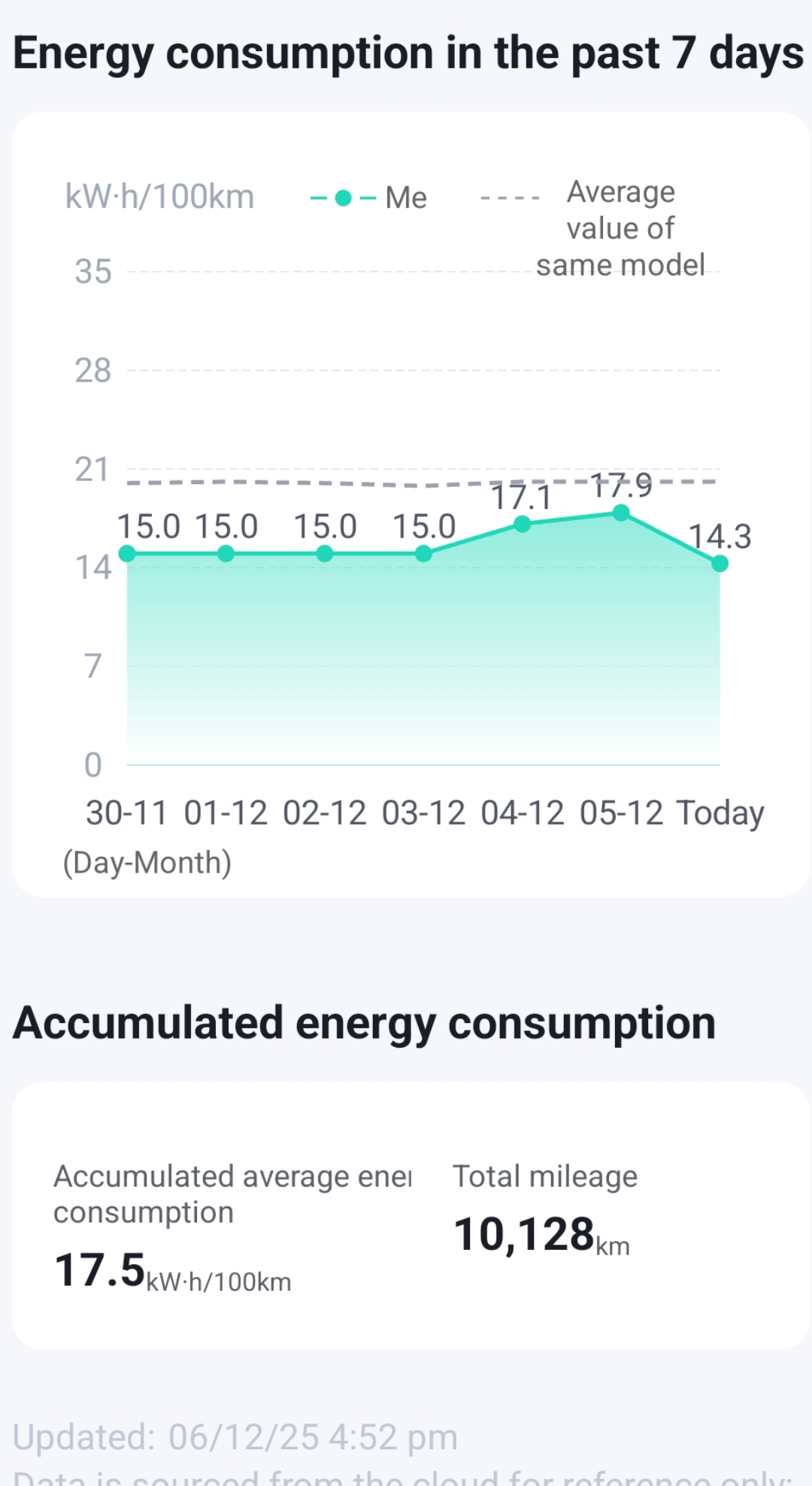 I recently completed 10k on my Byd Seal U (in NL) and tried to calculate the mileage I got. Based on couple of apps I use for charging, I would have charged 1930 Kwh since I bought it last year in August 2024. I got it delivered fully charged from the dealer, so should add 87 units, which makes it 2017 Kwh. This gives an average of 19.91 kwh/100 km. This is 2.4kwh/100km higher than what BYD app shows. I'm guessing app doesn't consider the energy consumed by the air conditioner/heating. App also shows the average consumption in last 7 days(added recently) and interestingly it also shows the average value for same model. Would be interested to know how's everyone else experience.