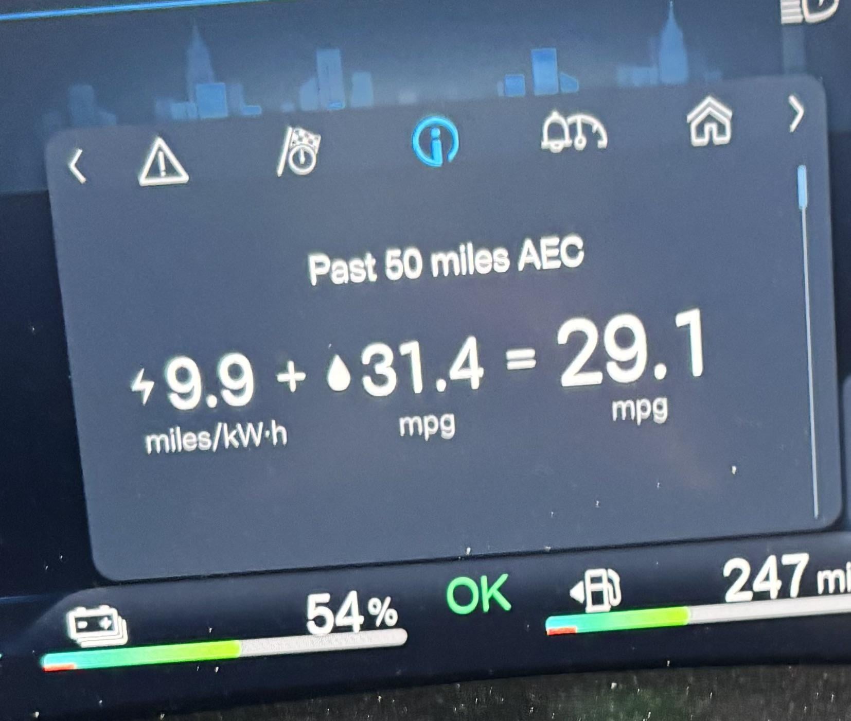 Had mine for 3 months and have to say that for motorway driving the fuel efficiency is terrible. On average I am getting less than 400 miles from a full https://preview.redd.it/3bawnh3n0pcg1.jpeg?width=1654&format=pjpg&auto=webp&s=c3a091c37d74ca2236eb34e03f185124b1450483 tank and charge. Really disappointed as I bought it based on the untrue range that they advertise. 29.1 mpg is 7.22 litres/100km