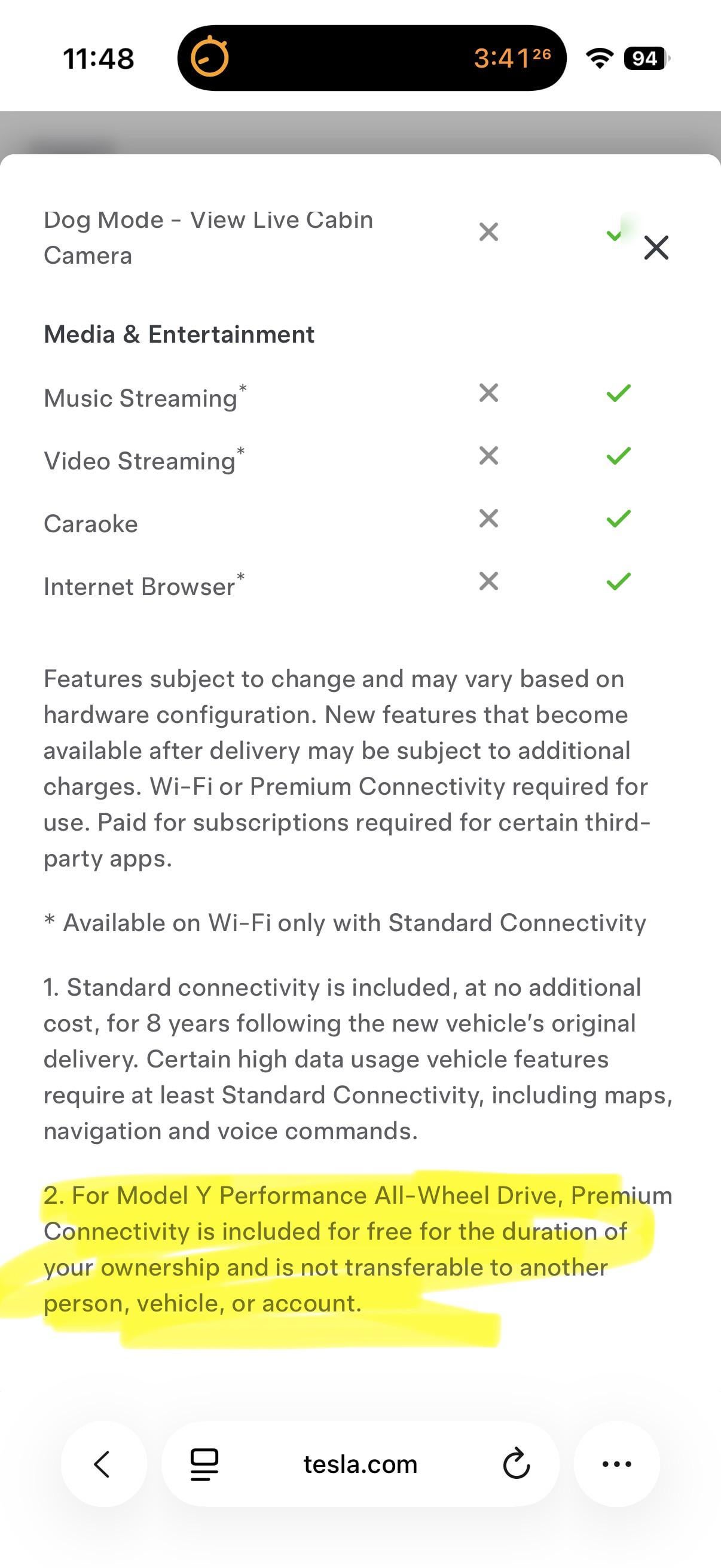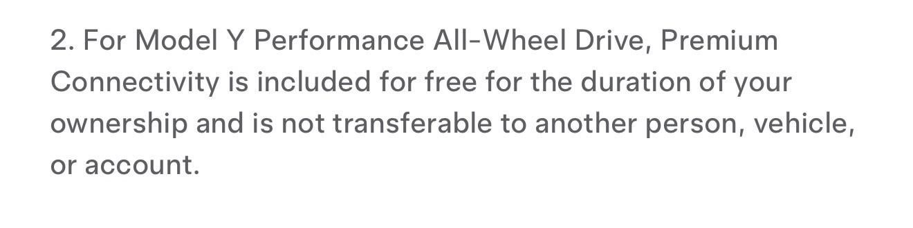 For Model Y Performance All-Wheel Drive, Premium Connectivity is included for free for the duration of your ownership and is not transferable