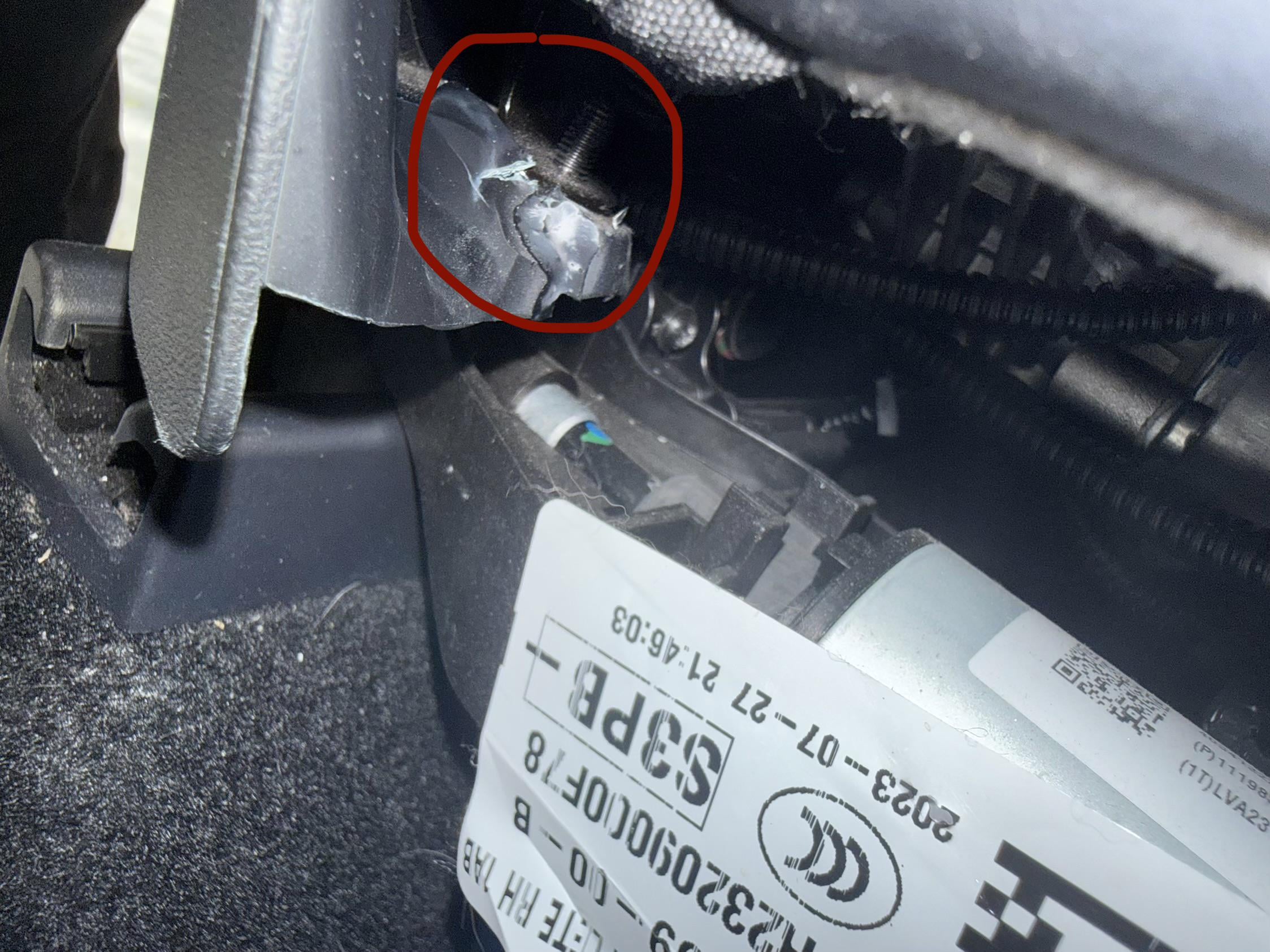 on my driver side, the piece looked like the picture. You could move it and was evident that it was broken. On the other side, I just happen to check that the plastic screw was turning white which was indiciating that it was about to break. Here is my picture I sent to Tesla on the passenger damage https://preview.redd.it/mhrilar1erng1.jpeg?width=2247&format=pjpg&auto=webp&s=b8e073e1e25bc0e400ea57f80aeb230fcf0c04d5
