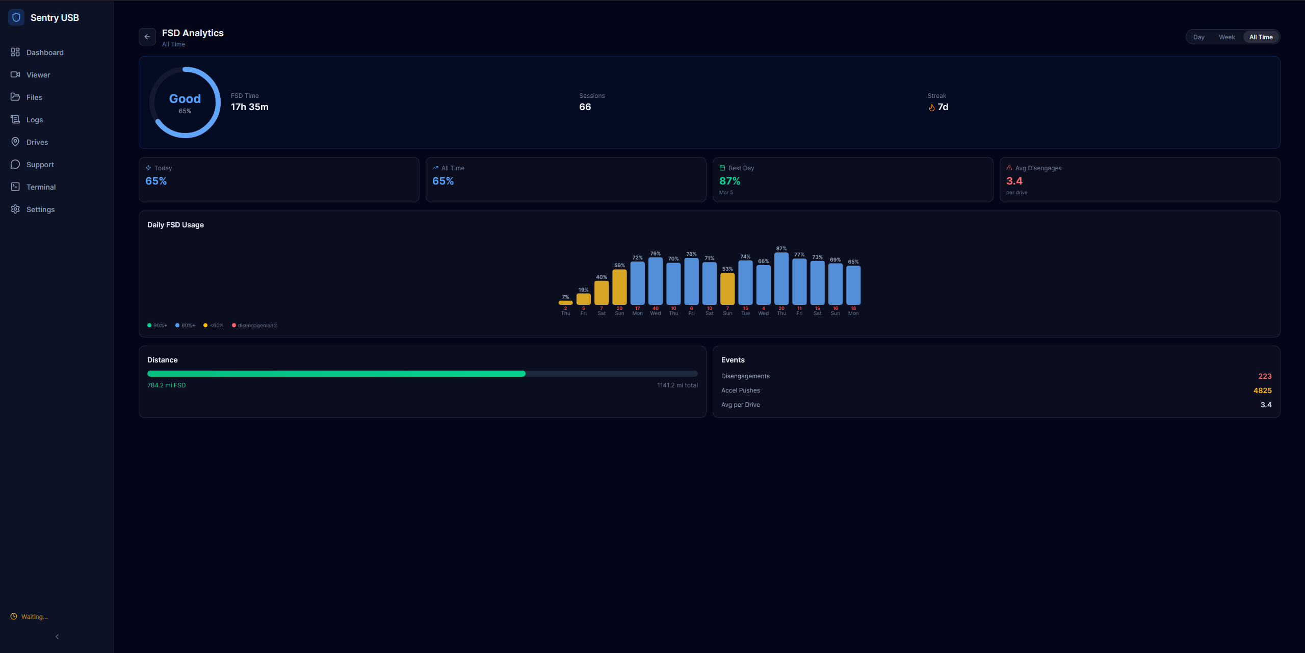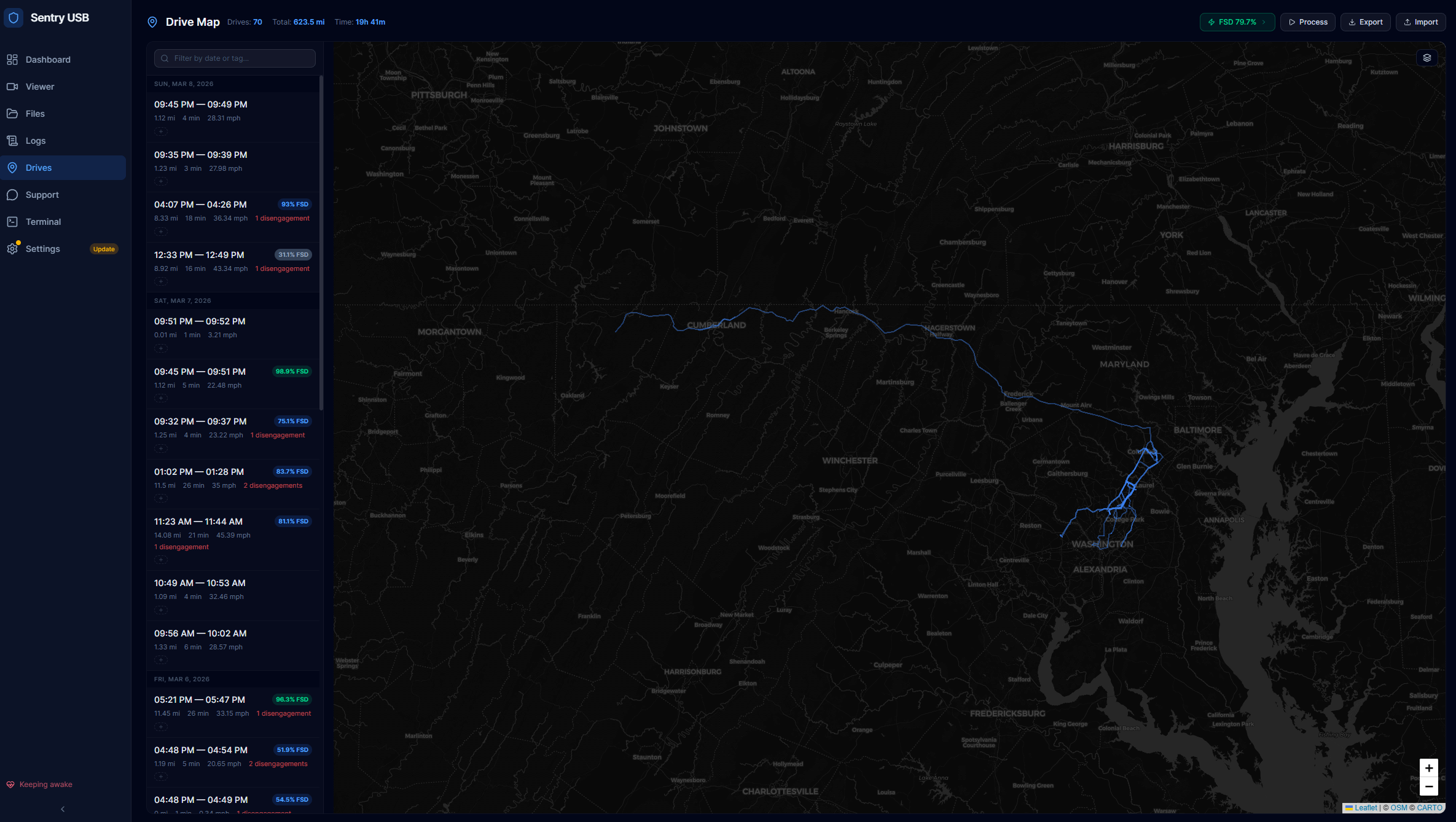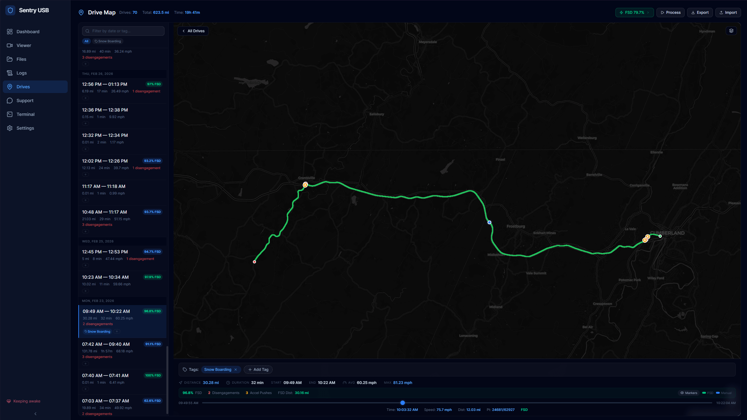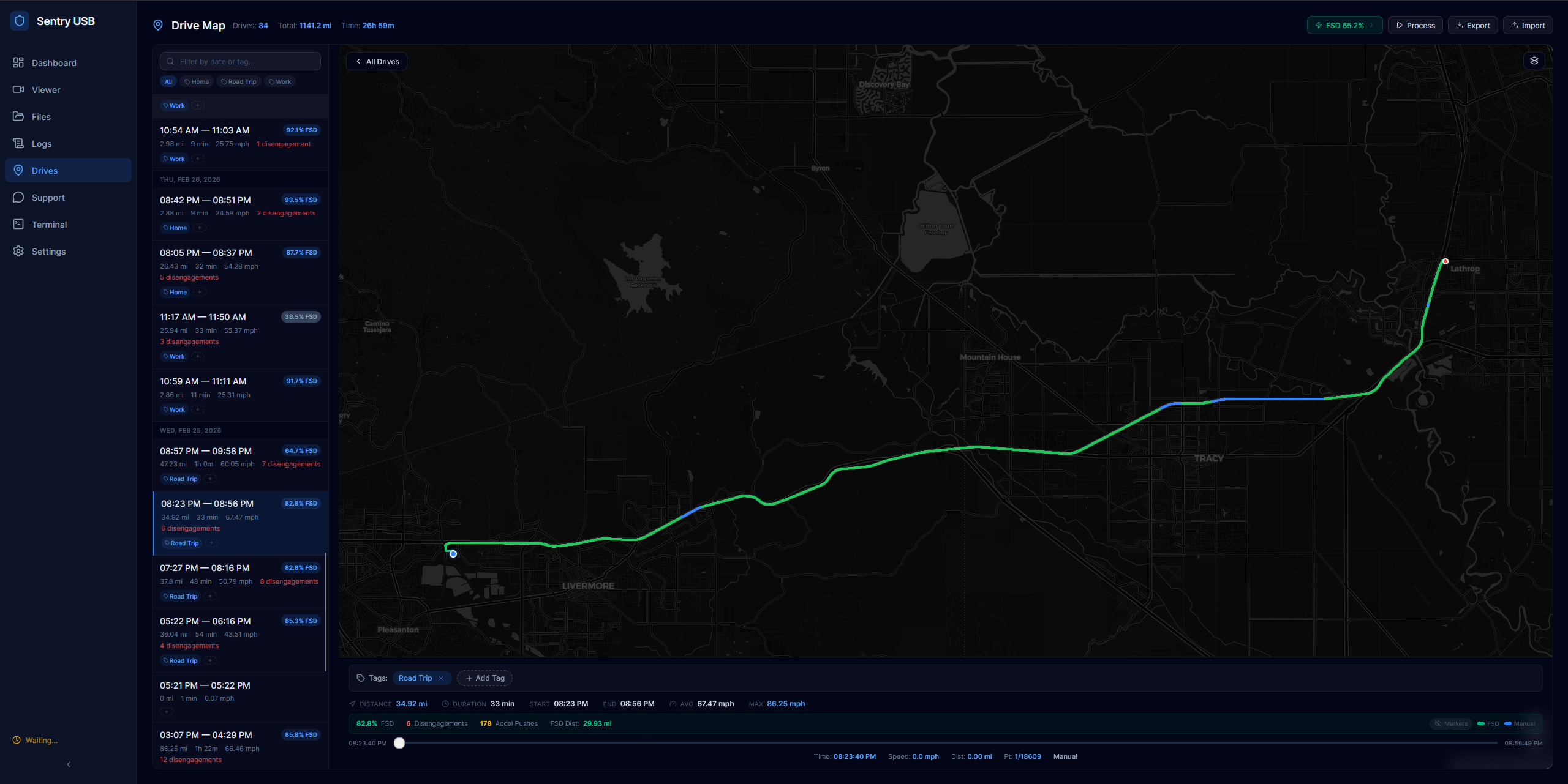 From that footage it extracts GPS, vehicle speed, gear state, and autopilot status. For FSD it tracks engagement %, distance on FSD, disengagements, and accelerator pedal pushes (driver interventions). All mapped on your drive route.