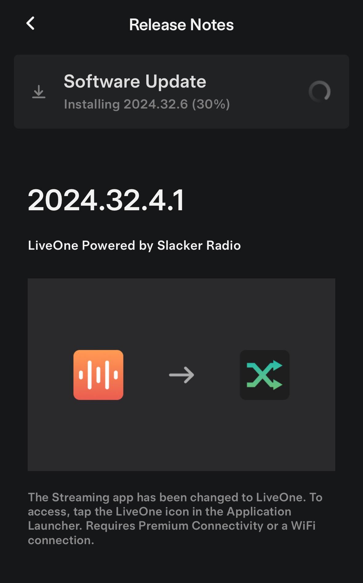 I just received 2024.32.6 and one of the updates from 2024.32.4.1 mentions Streaming is being replaced by LiveOne which is Slackers new name. https://preview.redd.it/z0u6afkob1sd1.jpeg?width=1179&format=pjpg&auto=webp&s=d3d4a59fcca8efd9ca9b26b88d3d88c9989fba72