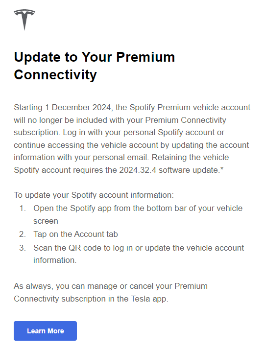 Just got this email 5 minutes ago: Update to Your Premium Connectivity --- Starting 1 December 2024, the Spotify Premium vehicle account will no longer be included with your Premium Connectivity subscription. Log in with your personal Spotify account or continue accessing the vehicle account by updating the account information with your personal email. Retaining the vehicle Spotify account requires the 2024.32.4 software update.* To update your Spotify account information: 1. Open the Spotify app from the bottom bar of your vehicle screen 1. Tap on the Account tab 1. Scan the QR code to log in or update the vehicle account information. As always, you can manage or cancel your Premium Connectivity subscription in the Tesla app.