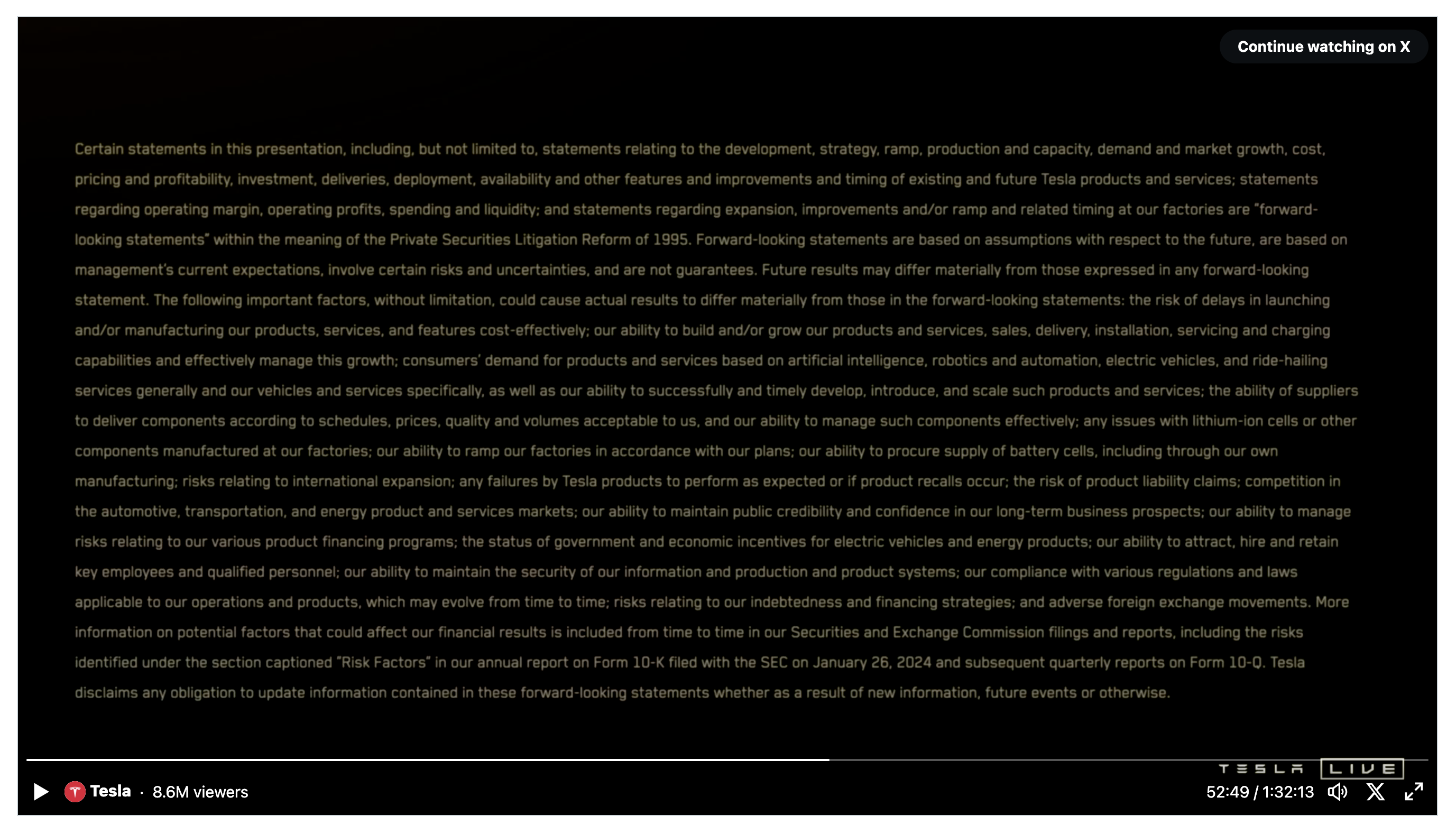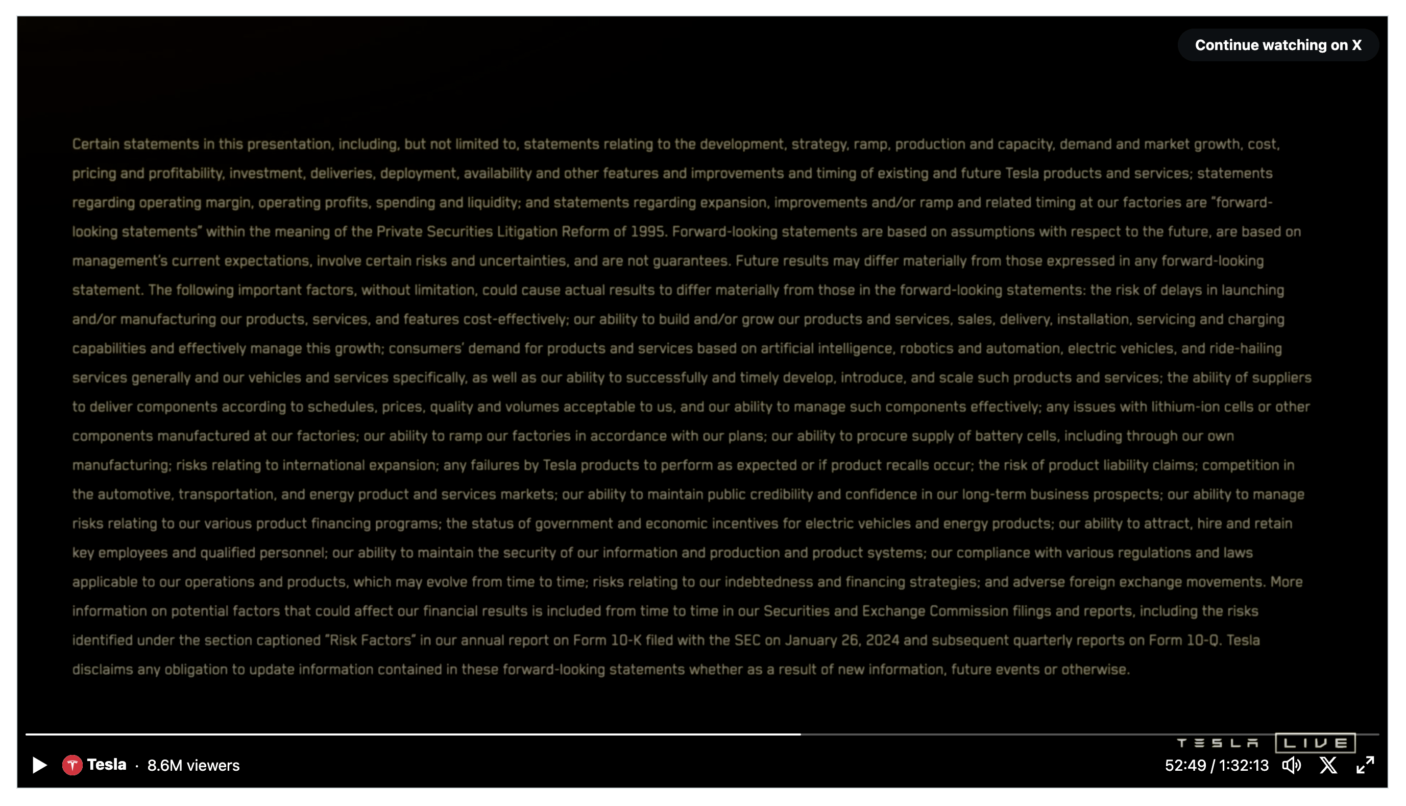 > Every company has the same type of disclosure Not Musk’s companies, not Tesla at any previous reveal event, that I can remember? Or at least, it wasn’t emphasized, read out loud front-and-center like this one. Somebody at Tesla got to thinking, guys, if we’re gonna say “unsupervised FSD by next year” _again_, maybe we better have an un-missable disclaimer…