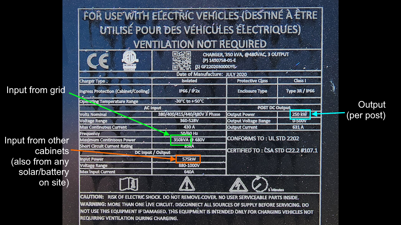 Ahh, yeah, that would probably be referring to the V3 cabinet. They are capable of drawing either 350 kW or 387 kW from the grid and each serves 3 or 4 posts at a maximum of 250 kW per post. Sounds like there could be contention if you're splitting 350 kW four ways, but the V3 cabinets can also share capacity between themselves, so if there are two cabinets next to each and one is entirely empty, the other cabinet can then effectively share 700 kW between its four stalls. But no matter how they are configured, no individual post will get more than 250 kW. Not a limitation of the post, but the output from the cabinet. [This is the nameplate from a V3 cabinet](https://i.imgur.com/ZBCDXXW.png). Sounds complicated! Don't worry, V4 does away with the connection between cabinets. Each cabinet has a single grid connection (presumed to be 1.2MW, but we haven't seen evidence yet) and eight posts (each capable of 500 kW). Obviously you won't get eight cars drawing 500 kW at a time, but Tesla have so much data on this that they've worked out that this ratio does not result in any noticeable contention, since cars are only at their peak speed for a very short part of their charge cycle, and for many cars, this peak will only be 250 kW, or 170 kW.
