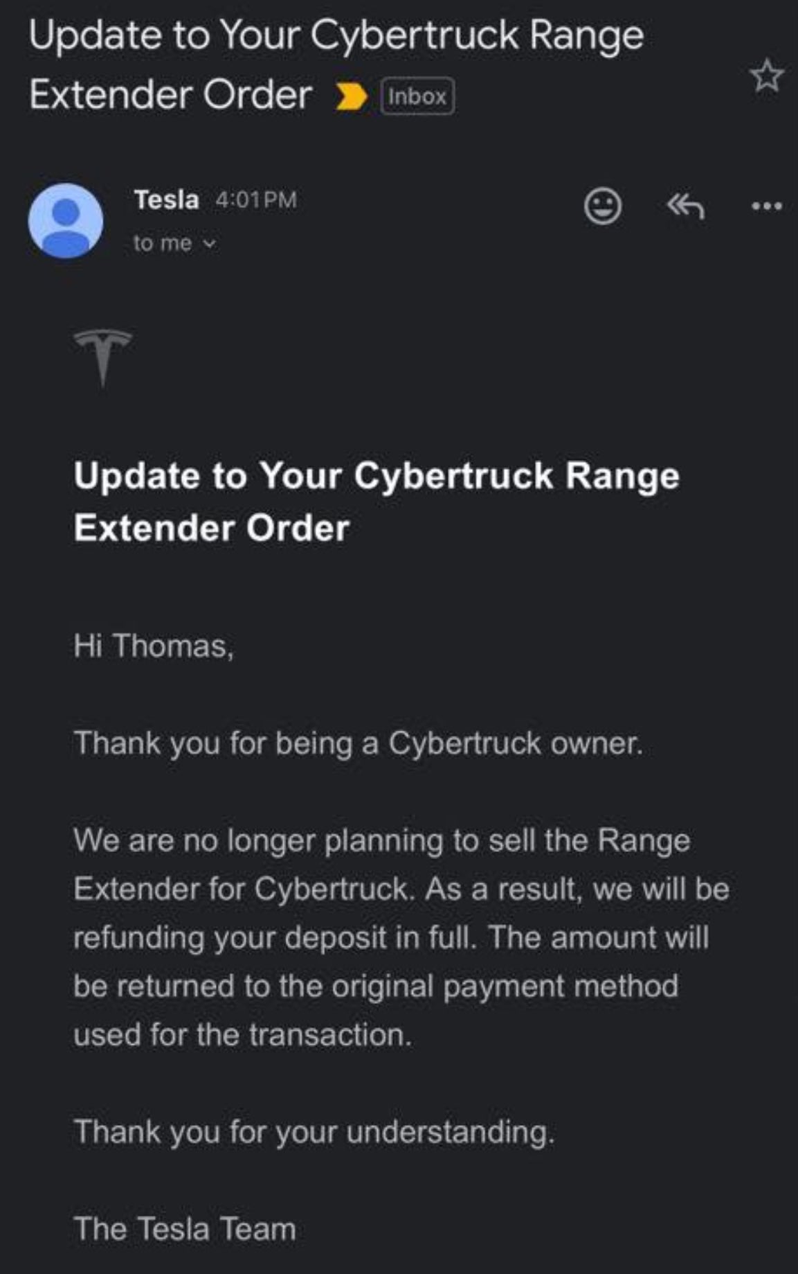 Tesla has canceled the Cybertruck Range Extender and sent an email notice to pre-orderers regarding a refund