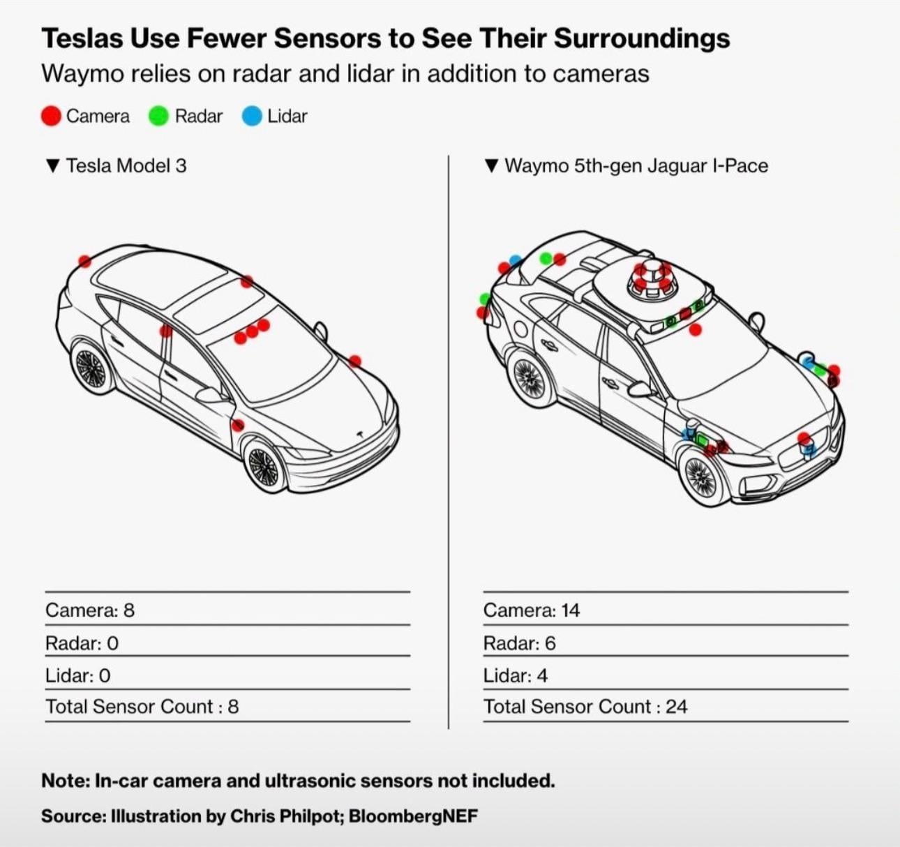 🚗 Tesla vs. Waymo: Two Very Different Roads to Full Autonomy 🛣️ Take a look at the illustration below (credit: Chris Philpot, BloombergNEF). It reveals just how differently two leaders in self-driving technology “see” the world: Tesla vs Waymo Cameras - 8 vs 14 Radar - 0 vs 6 Lidar - 0 vs 4 Total sensors - 8 vs 24 Key Take-aways 1. Minimalism vs. Redundancy Tesla bets on an 8-camera, vision-only stack. Waymo layers cameras + radar + LiDAR (24 sensors) for high-confidence perception. 2. Cost & Scalability Fewer sensors mean lower BOM and easier mass production for Tesla—but also heavier reliance on advanced AI to make up for missing depth data. 3. Edge-Case Handling Multi-modal sensing (Waymo) can offer robustness in low-light, glare, and inclement weather. Vision-only (Tesla) must solve these purely in software. 4. Compute Requirements More sensors = richer data = greater processing demands. Waymo’s stack leans on hefty onboard compute; Tesla optimizes around its custom FSD chips and over-the-air neural-network updates. Which philosophy will win out as we close in on Level 4/5 autonomy— AI-centric minimalism or sensor-fusion redundancy? And how should startups or tier-1 suppliers and OEMs position themselves in this debate? Drop your thoughts below! 👇